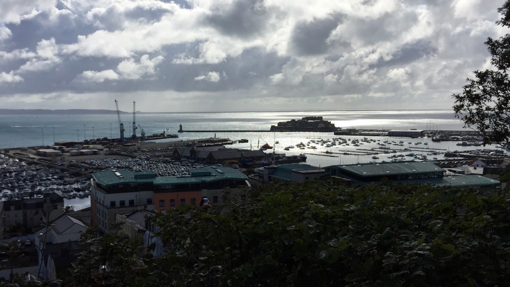 We then continued our walk to the reception venue, which took about a quarter of an hour as it’s a bit further. We didn’t go in there either, but it’s a nice building, and the view from the grounds towards the sea is great. There’s a plaque on a balcony telling you how far different places are in each direction – from local islands like Sark and Herm to international places like London, New York and Paris. It was a bit of a cloudy, grey day – it had even tried raining a little bit at one or two points – but the view was still impressive nonetheless.
