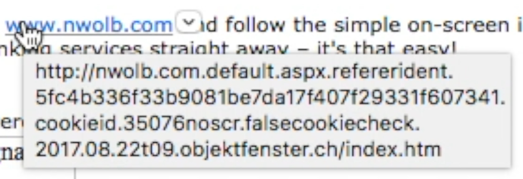 And most importantly, the clickable links don’t go to the places you expect. In the Natwest email, the text displayed for the link says “www.nwolb.com” – which is a genuine Natwest site – but the actual address the link is pointing to is at “objektfenster.ch”, which is an obscure foreign site that has nothing to do with them. They’ve just made the link say “nwolb.com” to try and trick you into clicking it.