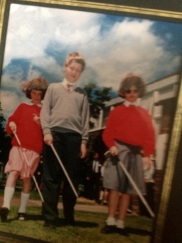 A picture of me at school with 2 female friends, each of us holding a white symbol cane in front of us, diagonally across our legs. I’m in the middle, wearing a grey jumper and black trousers, whilst the girls are wearing red jumpers and either a pink or grey skirt respectively.