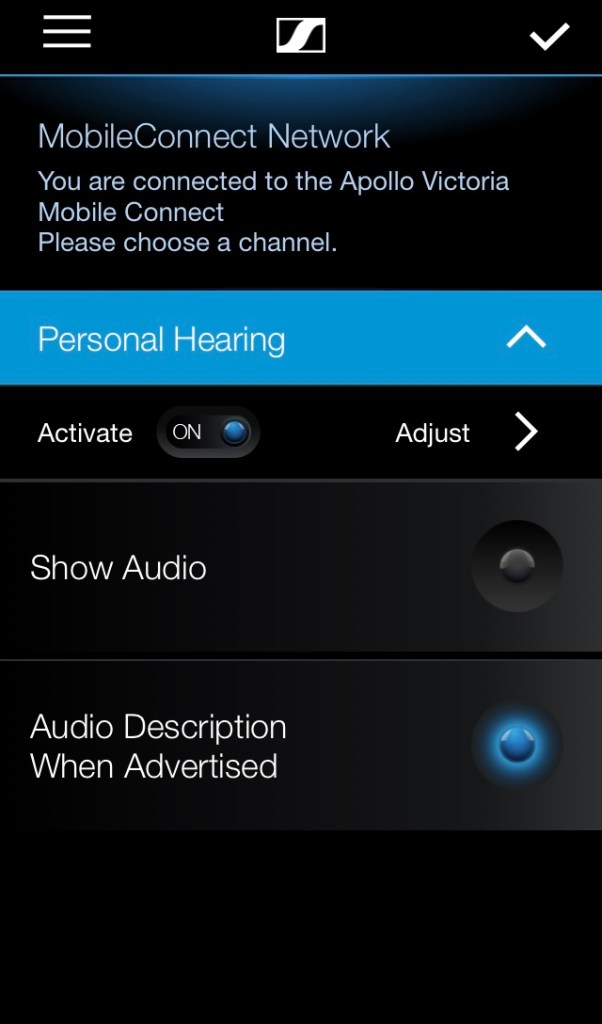 The app then connects to that network, and gives you the option for audio description, which you can click to activate it. There’s also a second screen where you can adjust the audio to suit your needs, with a blue circle that you move around the screen – left for more bass, right for more treble, up for more volume and down for less volume.