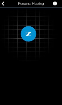Personal hearing screen in the Mobile Connect app, which simply has a grey grid on a black background, on top of which is a large blue circle. You can move this circle anywhere on the screen to get the sound you want. Move it left for more bass, right for more treble, up for more volume and down for less volume.