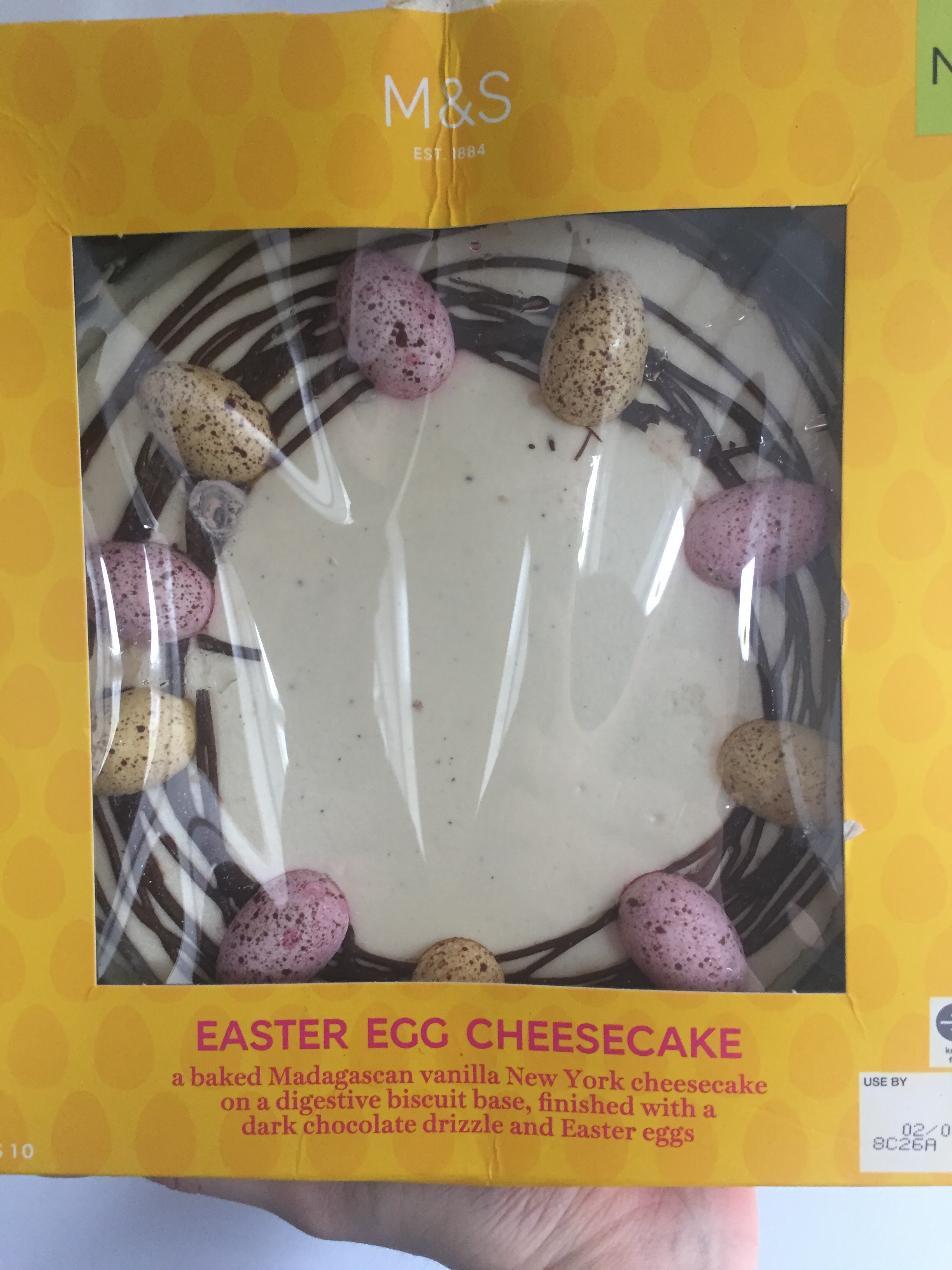 - Easter Egg Cheesecake, which is a large cheesecake with chocolate eggs on top. It’s lovely and creamy with a thick biscuit base, so you don’t need a big slice to satisfy you, and it tastes great.