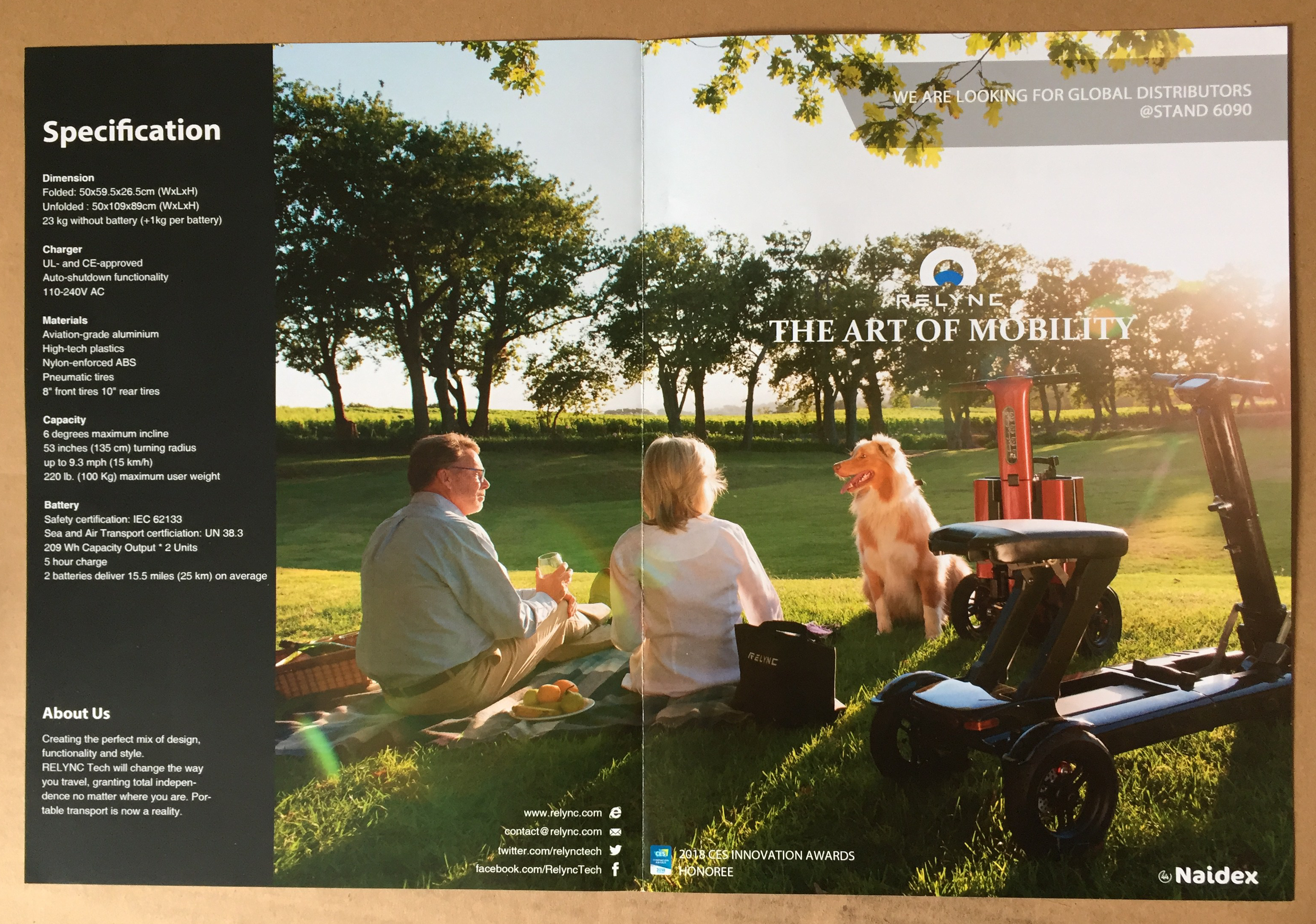 Relync manufactures mobility scooters, with a folding design and trolley mode for easy transportation. A smartphone can also be used to lock, unlock, locate and get diagnostics and status updates from the scooter.