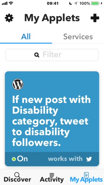 So for instance, I have it set to automatically tweet certain followers whenever I do a blog post with the category Disability. I also have all new blog posts automatically tweeted to certain blog sharing accounts, and I have all new Youtube videos automatically shared to Facebook. Once you get used to it, the applets, as they’re called, are all really easy to set up, and it just makes things a little bit easier.