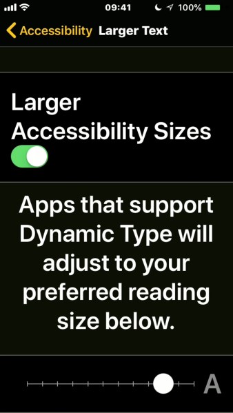 As the name suggests, this allows me to set a particular text size, which is then used by apps that support the Dynamic Type feature. Not all apps do support it, but it’s useful for those that do.