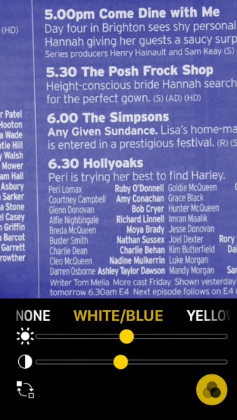 It also has various additional options. You can turn your camera’s light on, lock the focus, freeze the image on screen so that you don’t have to keep holding your phone up to something, adjust the brightness and contrast levels, invert the colours, and select from a range of other colour combinations to make things easier to read. So it’s a really versatile and useful app, but it’s rather hidden if you don’t know it’s there.