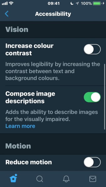 Then under Accessibility, I’ve turned on Compose Image Descriptions, which means every time I upload an image, I can type a description that blind people will hear spoken to them through their screen readers. So everyone should turn that on as a bare minimum, because image descriptions are very important, and it would be great if it were turned on by default really.