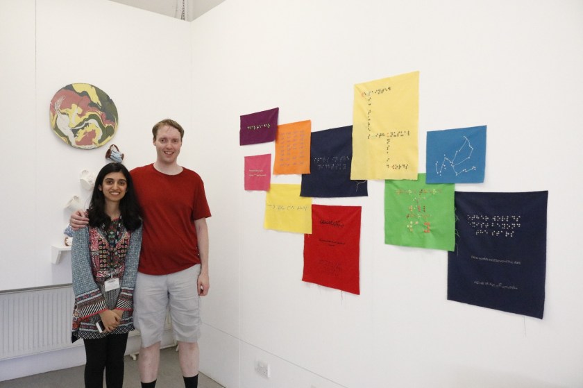 I was invited along to the Camberwell College Of Arts by a wonderful student artist called Nihan Karim, to look around their MA Visual Arts Summer Show. She got in touch because her own artwork is for visually impaired people, particularly braille users. And her artwork consists of various pieces of coloured fabric, each with braille writing on them, and together they form a cohesive piece with a nice message across it. It was lovely and striking to look at, plus there was a leaflet translating it so I could understand it as well, and liked the way it all came together. It was also great to talk to Nihan about the work and her reasons for doing it.