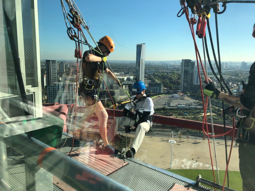 We did it! 🙂 On Sunday 21 October, after a month’s delay due to the typical British weather, I finally got to do my charity abseil down the ArcelorMittal Orbit Tower in aid of nystagmus research. That’s a drop of 80 metres (262 feet) from the UK’s tallest sculpture!