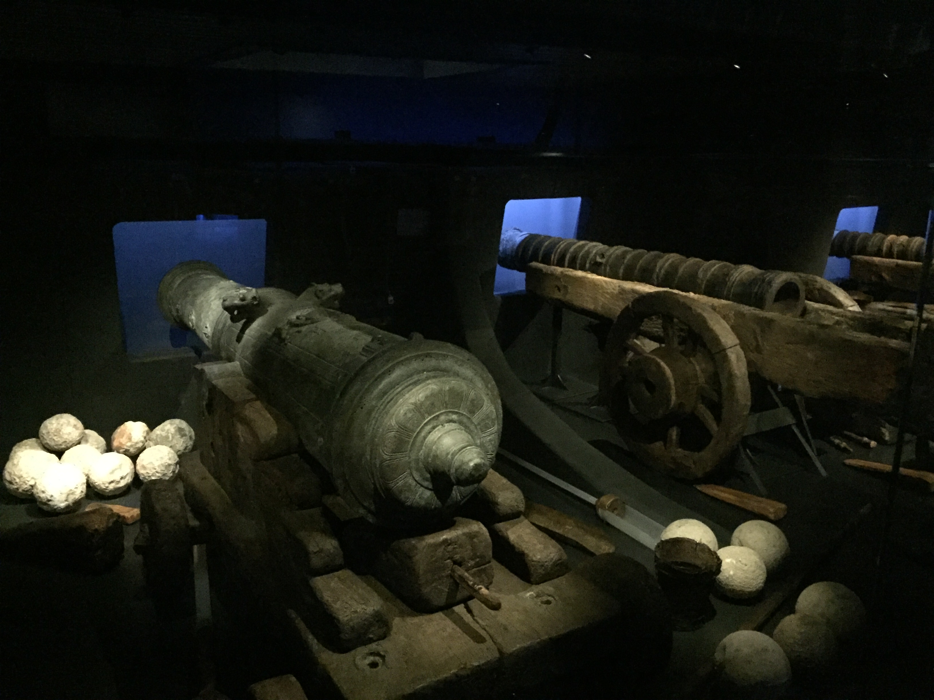 It is quite dark in there (as it needs to be, to help preserve the ship and the objects), but I could see enough, either using my monocular or looking closely at the photos I took. They don’t have audio guides unfortunately, but they do have large print guides, as long as you can find the right lighting spots to read them under, so they were really useful. There’s also an area where you can handle objects, so we got to feel and look at original pieces of wood from the boat, along with chainmail, and some of the heavy rope used for the anchor. And in another area you can look at costumes from the time and try a few things on. We only put on a few hats, but we enjoyed watching other younger visitors getting more dressed up, it’s great for them.