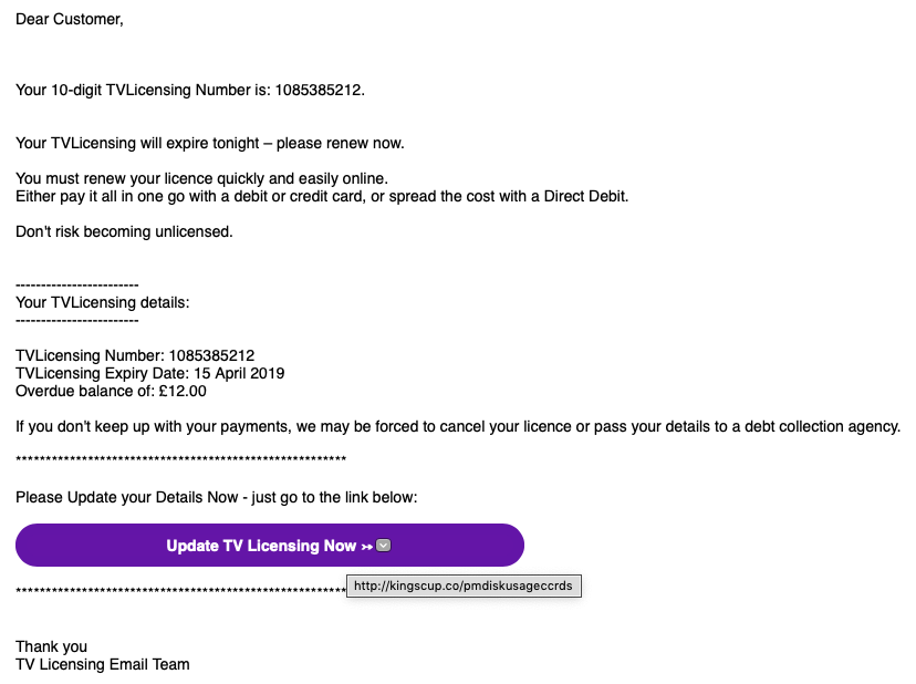 Most importantly though, hovering over the link shows that it’s pointing to http://kingscup.co/pmdiskusageccrds. That’s clearly nothing to do with TV Licensing, and is completely different to the From address as well. So don’t click on it or give any information.
