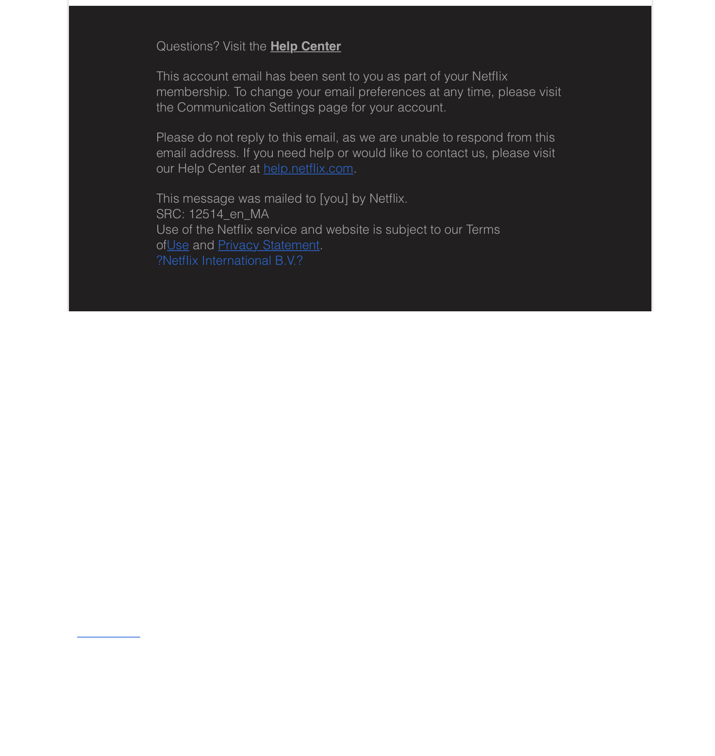 This account email has been sent to you as part of your NetfIix membership. To change your email preferences at any time, please visit the Communication Settings page for your account.