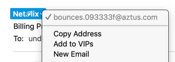 Furthermore, when you click on the name to see the actual address behind the name, it isn’t Netflix related in the slightest. For the latest 3 emails, the names and addresses have been: