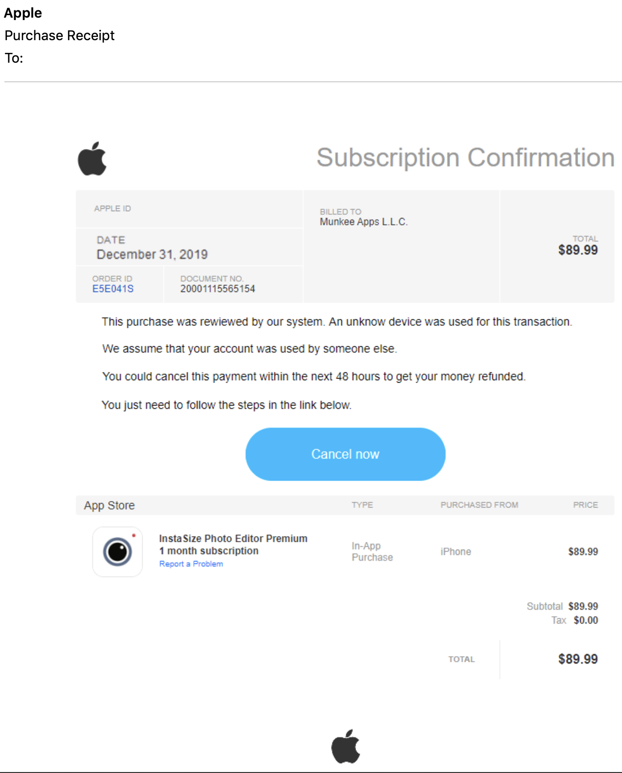 The message calls itself a “Subscription Confirmation”, claiming that a purchase has been made for a 1 month subscription to InstaSize Photo Editor Premium for $89.99. It has the Apple logo at the top and bottom, along with today’s date, an order ID and a document number to try and make it look authentic. But there are various giveaways that it’s fake.