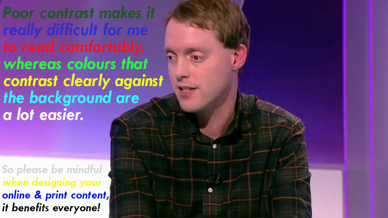 Poorly contrasted text is nigh on impossible for me to read e.g. red on black, grey on white, etc, preventing my use of websites, printed material, signs, etc. Even normal sighted people will find it hard. Please bear that in mind when designing content.
