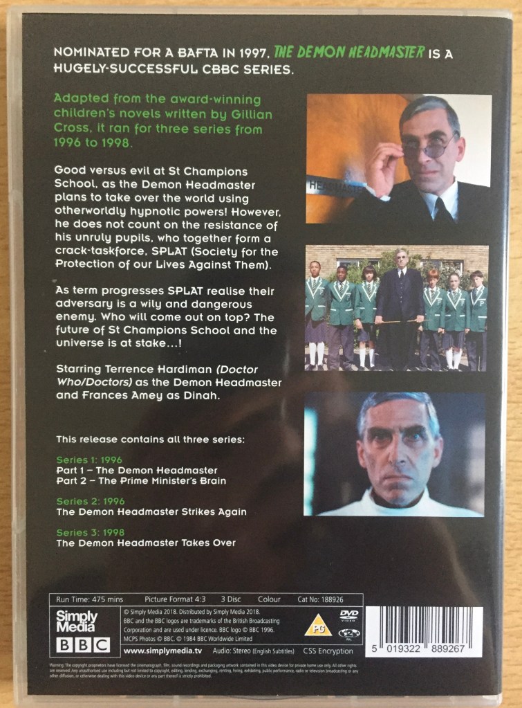Perhaps surprisingly, I decided to go on a nostalgia trip this month by treating myself to all 3 series of The Demon Headmaster on DVD. It’s very rare for me to buy a children’s series, because most of the ones I saw as a kid I’m not interested in keeping or rewatching as an adult. But I’ve always had a particular fondness for this show, about a headmaster who can hypnotise almost everybody and has dastardly plans to take over the world. It’s just stuck in my mind ever since I was young, and I know from social media I’m by far not the only one. So perhaps the main character really was as powerful as he claimed!
