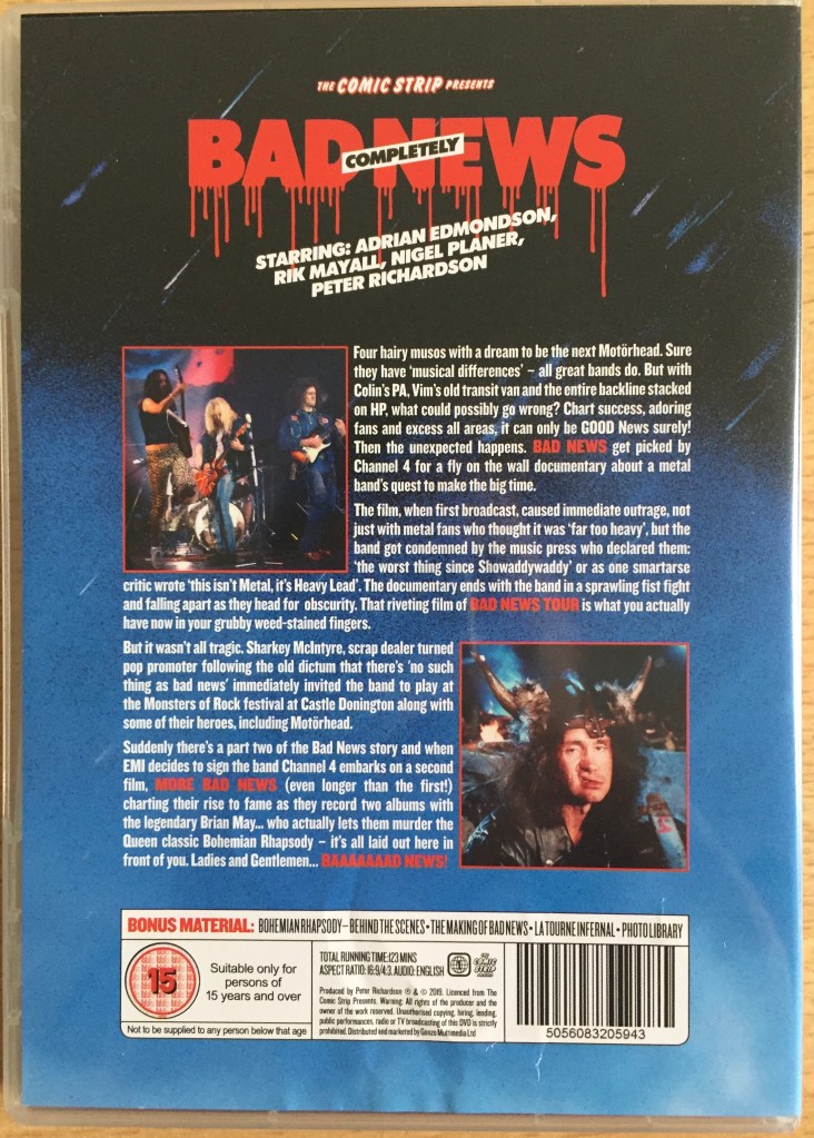 The DVD features both of their Comic Strip episodes, plus a few extras including their deliberately awful Bohemian Rhapsody music video with some additional footage (their cover having been approved by Brian May who helped to produce their music), plus a little retrospective featuring Nigel and Peter playing their characters, and for some reason a foreign version of the first episode. Without the latter, everything could have been squeezed on to one disc really.