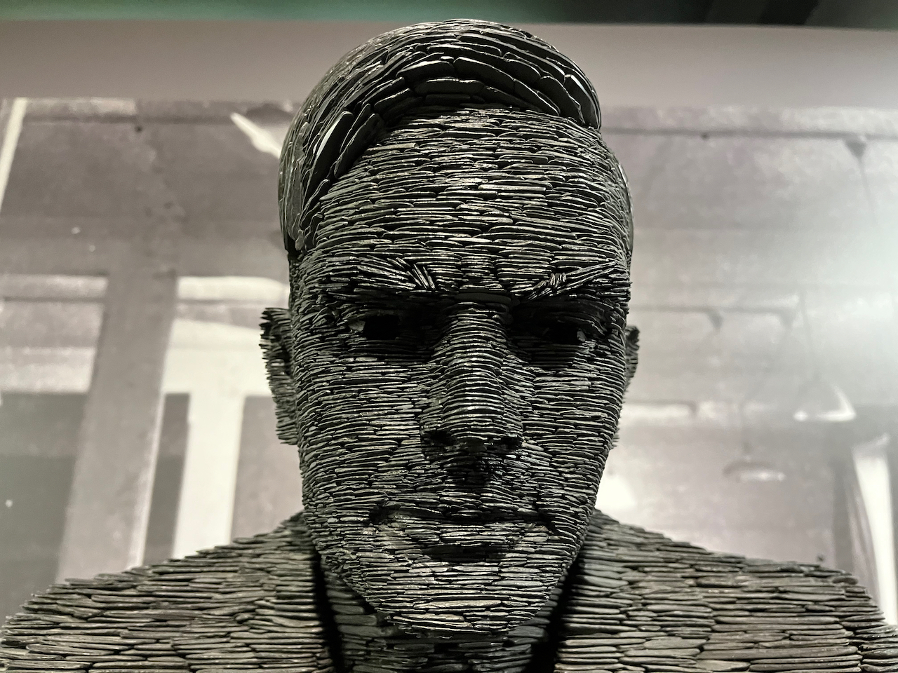 - Finding out more about the genius Alan Turing, who played a vital role in the codebreaking operation. There’s an impressive statue of him by Stephen Kettle in the museum, made out of lots of pieces of slate, along with some of his possessions, including a cute teddy bear, a watch, school prize books, and items from King’s College Boat Club. And you can see his office in Hut 8 as well. Indeed, there are a few huts full of offices, replicated in great detail as they would have been at the time for processing intelligence. Some of the rooms even have projected videos on the walls of people working, or audio playing of people talking, examples of which are in my video at the start of this post. So it’s all quite atmospheric.