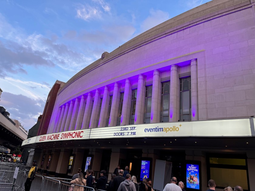 Alt Text: “The Eventim Apollo building in Hammersmith, with writing on the long white lit-up curving canopy over the entrance doors that reads Queen Machine Symphonic, 23rd September, doors 7pm.”