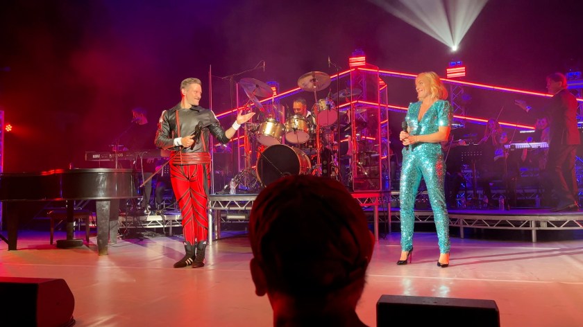 Alt Text: “Queen Machine in concert at the Hammersmith Apollo. The lead singer looks a bit like Freddie Mercury, with his moustache and body-hugging outfit of black jacket and red trousers. He’s smiling and gesturing towards West End star Kerry Ellis, a smiling blonde lady wearing a very sparkly, short-sleeved, low-cut, light blue bodysuit, along with black high heels. Behind them, to the right of the drummer on his large kit, the London Symphonic Rock Orchestra are playing on stringed instruments.”