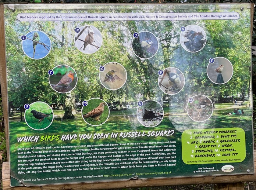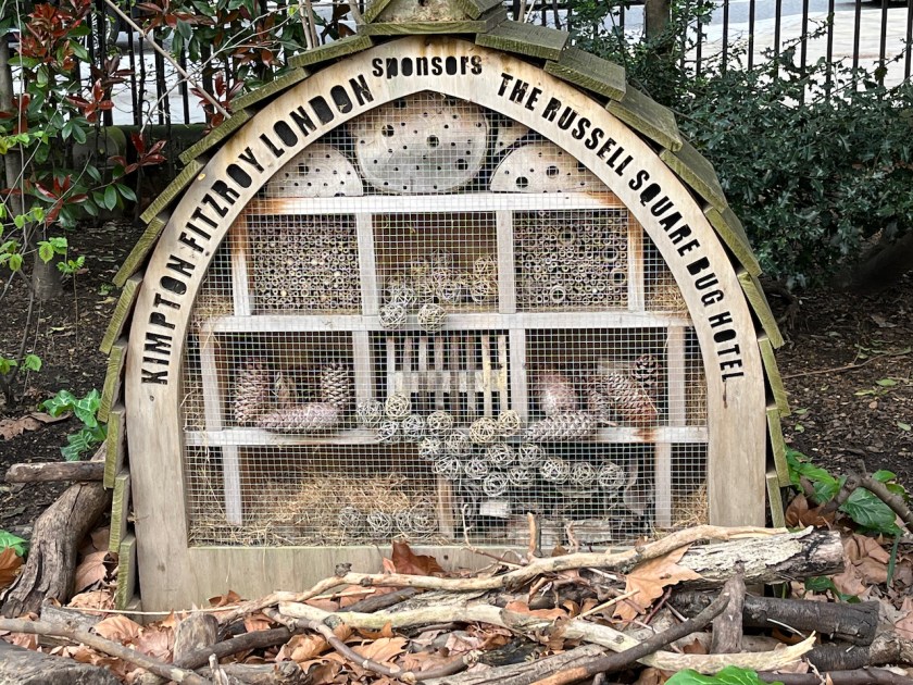 The squares aren’t very big, but they’re nice areas to sit and relax, and each has a couple of things worth looking out for. In Russell Square we had a drink from a nice little café, where they serve quite a variety of nibbles, and we saw a wooden arched insect hotel that had sections suitable for bees, spiders, ladybirds, lacewings, robins and butterflies. And in Tavistock Square there are statues of Mahatma Gandhi and Virginia Woolf. So that was a very pleasant afternoon.