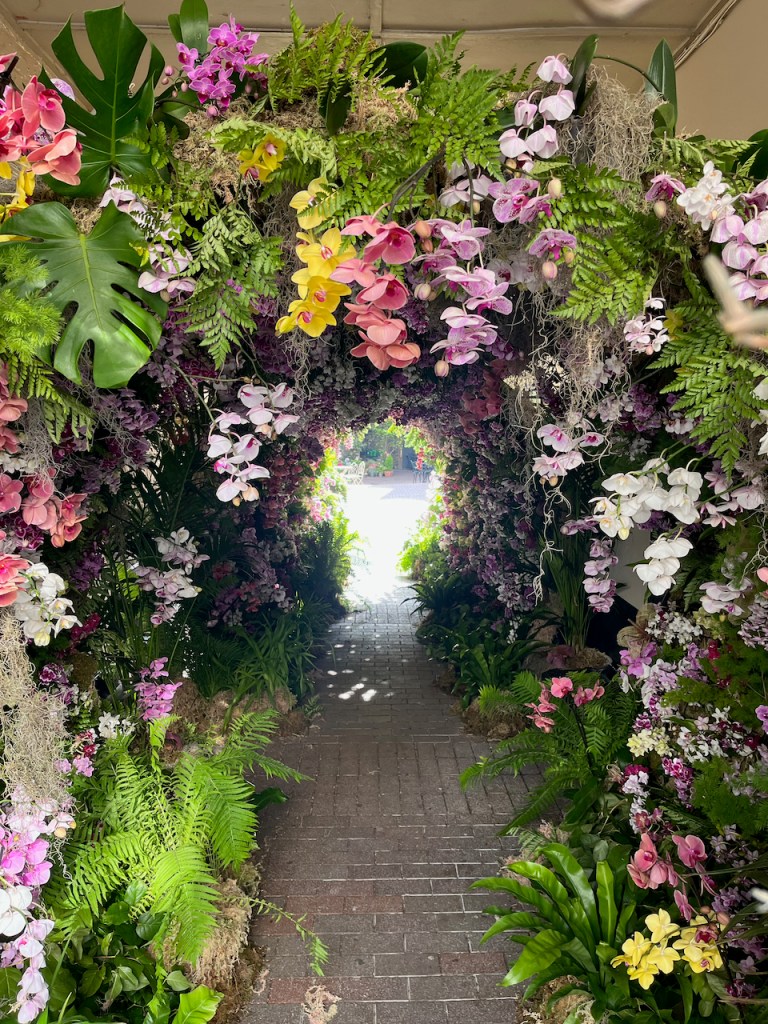- Orchids & Butterflies by Judith Blacklock Flower School – A tunnel of colourful orchids, with a parrot on the railings at the entrance.