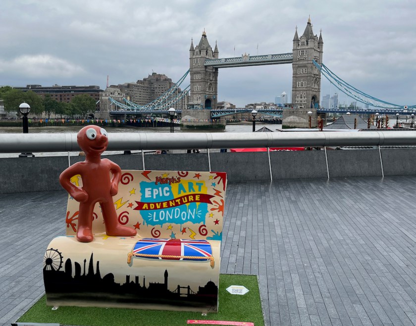 - Morph Over, There’s Room for Two! by Mik Richardson – Continue following the path around the top of The Scoop, and this is on a section near some steps that take you back down to Queen’s Walk (there is step-free access nearby though). You can sit on this bench for a photo with Morph, with Tower Bridge and/or the Tower Of London in the background depending on the angle. This was one of the few stragglers I found on a free weekday, as it was installed a bit later than the others nearby.