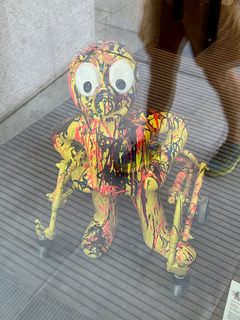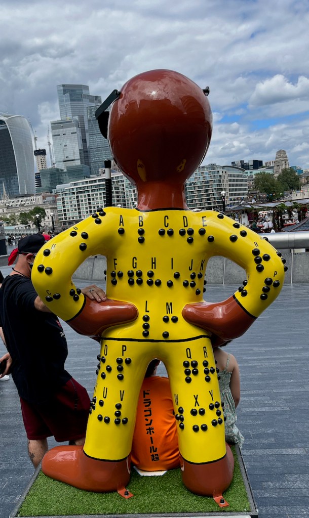 - The Power of Morphing Communication by Clarke Reynolds (aka Blind Braille Artist) – Naturally this is my favourite one, as this bright yellow Morph, wearing sunglasses and holding a long cane, has black tactile braille lettering all over him.