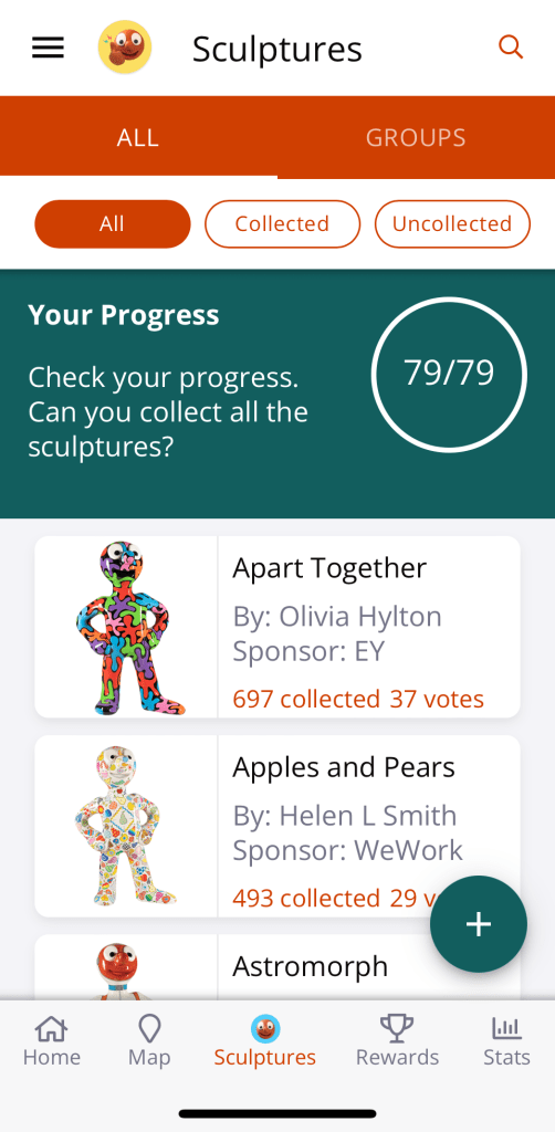 Most importantly, you can track your progress in the app by entering the 4-digit codes from the information panels by the sculptures. There are separate codes for each of the big statues, while the miniature ones are organised into groups with 1 code per group. The app will then change the colour of the relevant markers on the map, and you can see lists of the statues you’ve collected or still need to collect. It says I’ve collected all 79 statues already, despite having only seen 78, because the missing one is coming soon as an addition to an existing group, so it’s already counted it.