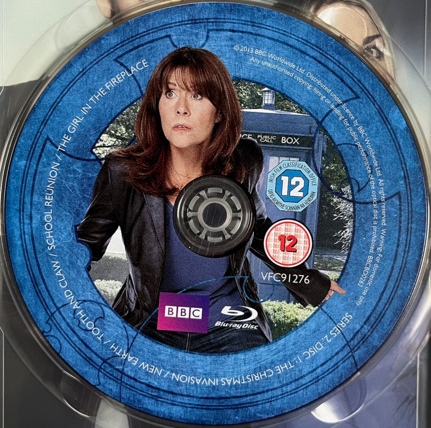 Inside the steelbook, behind the spindles for the discs, there’s a nice photo of the Doctor and Rose next to an image of the Tardis in flight. And the 3 discs themselves carry images of Sarah Jane Smith, a Cyberman and a Dalek.