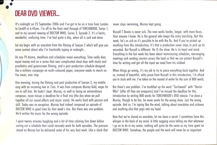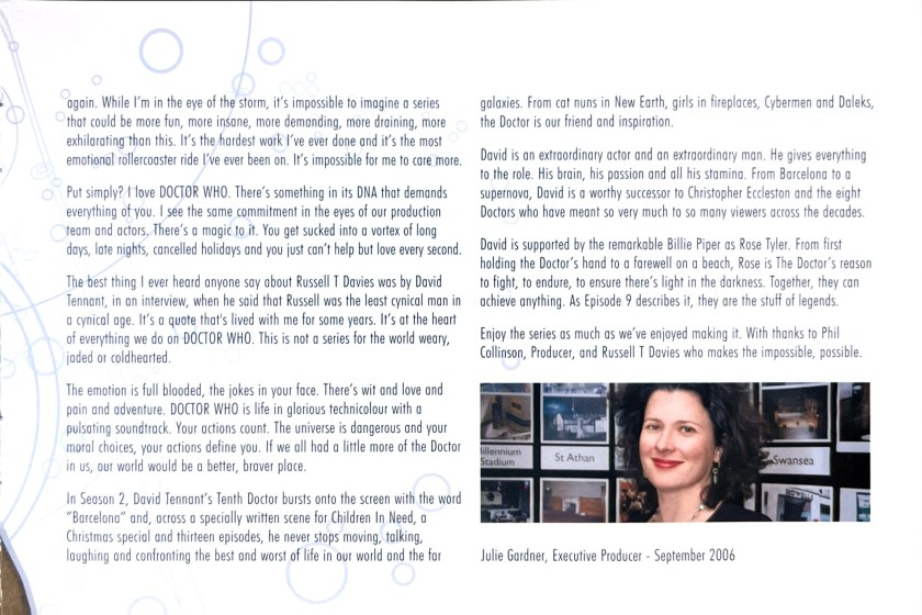 It also had a booklet with a foreword from Executive Producer Julie Gardner, some nice photos and artwork, and details of what was on each disc, including episode descriptions, credits, chapter points and extras. So I’ll be including some of the images from that book in this post. It is a shame they haven’t included booklets like that with the Blu-ray steelbooks, though I appreciate there isn’t room for anything too thick. And there are also slight differences in the extra features on the Blu-ray compared to the DVD, as I’ll mention later in this post.