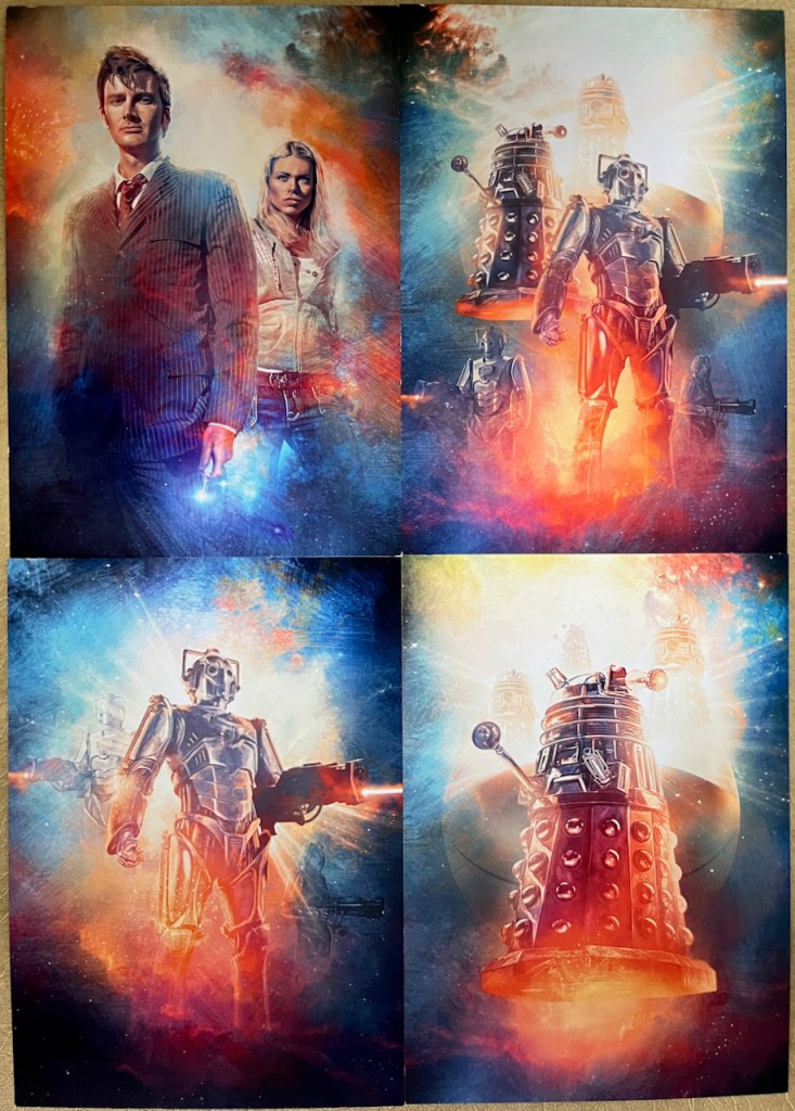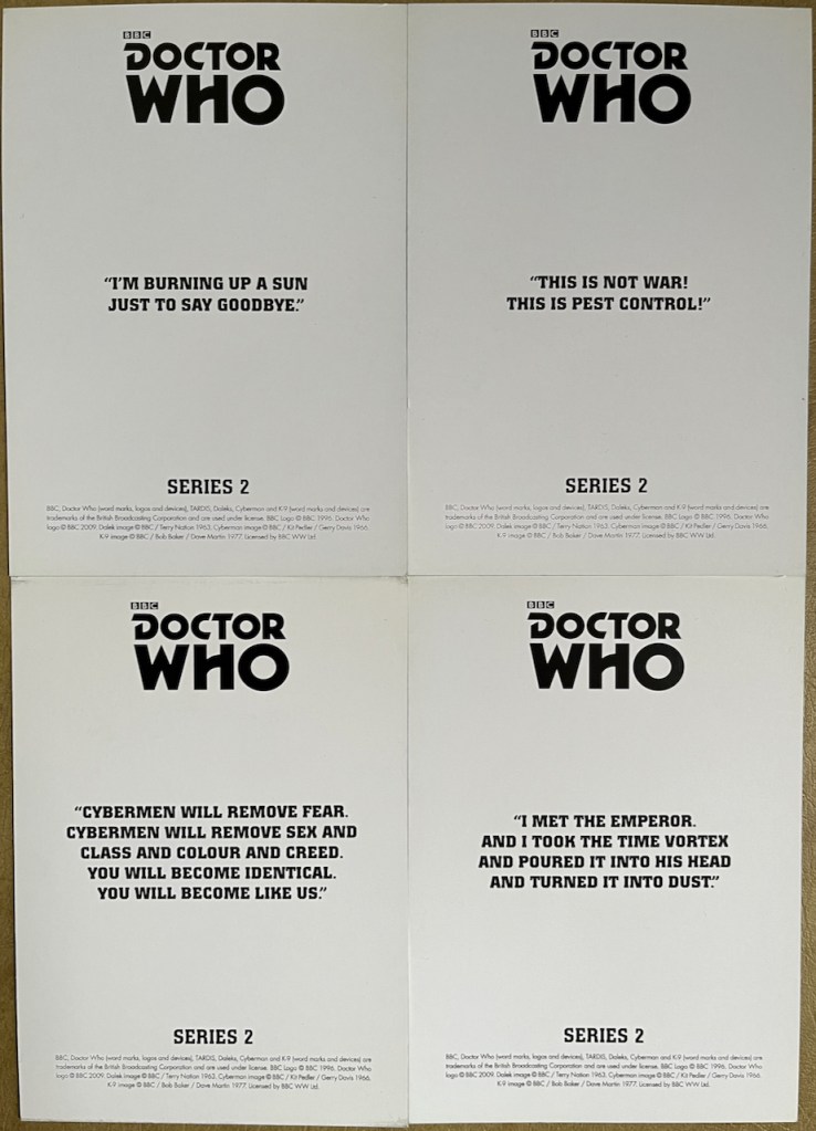The 2 cover images are replicated on some cool postcards in the set, along with 2 further cards with artwork of a Cyberman and a Dalek. Each card also has a memorable quote from the series on the back.