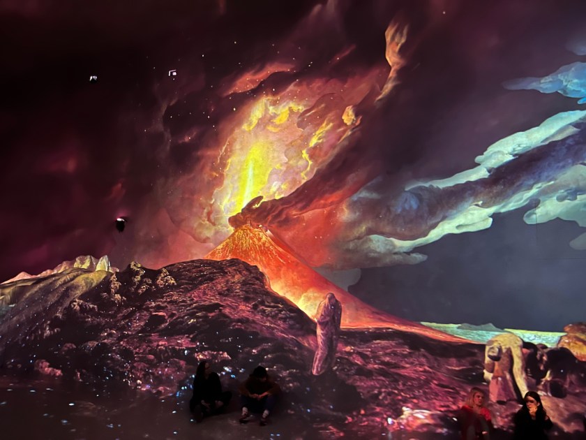 - The World Around Us – By far the largest of the four rooms, here you’re surrounded by gigantic projections of landscape artworks, ranging from the serenity of The Rainbow Landscape by Peter Paul Rubens and the pretty Piazza San Marco by Canaletto, to the dramatic Christ in the Storm by Rembrandt van Rijn and the intense Vesuvius in Eruption by Joseph Wright of Derby. Whereas the other galleries use original music, these paintings are accompanied by a mix of 9 classical pieces curated by Ron Colvard, ranging in tone in the same way as the artworks. And such is the versatility of this large space that there are even immersive yoga classes held here once a month.