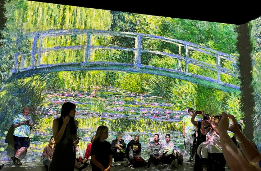 - Colour In Motion – For me this felt like the cleverest room in terms of the technology involved. At regular intervals the walls go blank, but on the floor are thousands of digital elements floating around like confetti, which you can sweep and kick towards the walls to form the next piece of impressionist art, including a self-portrait of Vincent Van Gogh, and The Waterlily Pond: Green Harmony by Claude Monet. I have no idea how it’s done, but the motion sensing technology is remarkably accurate considering the large number of people in there, all moving around in different directions. It was very responsive to me, as I had fun clearing pathways while looking around. The music in this room is an original score by Nick Powell.