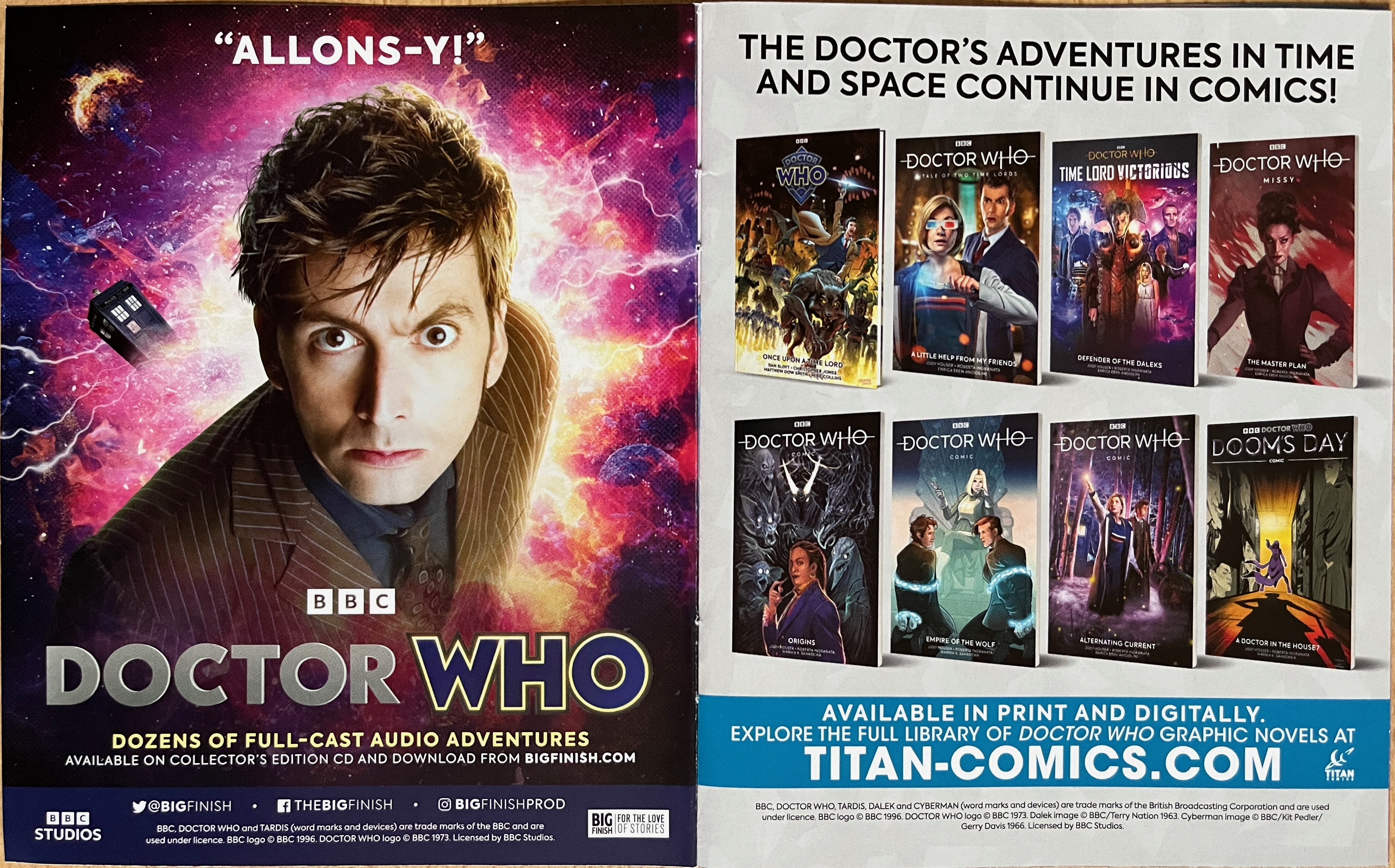 - Audiobooks, including full-cast adventures from Big Finish, the Doctor & Donna in a collection of BBC titles, the Decades Collection of novels covering the 1960s-1980s & 1990s-2010s, and vinyl LPs from Demon Music Group.