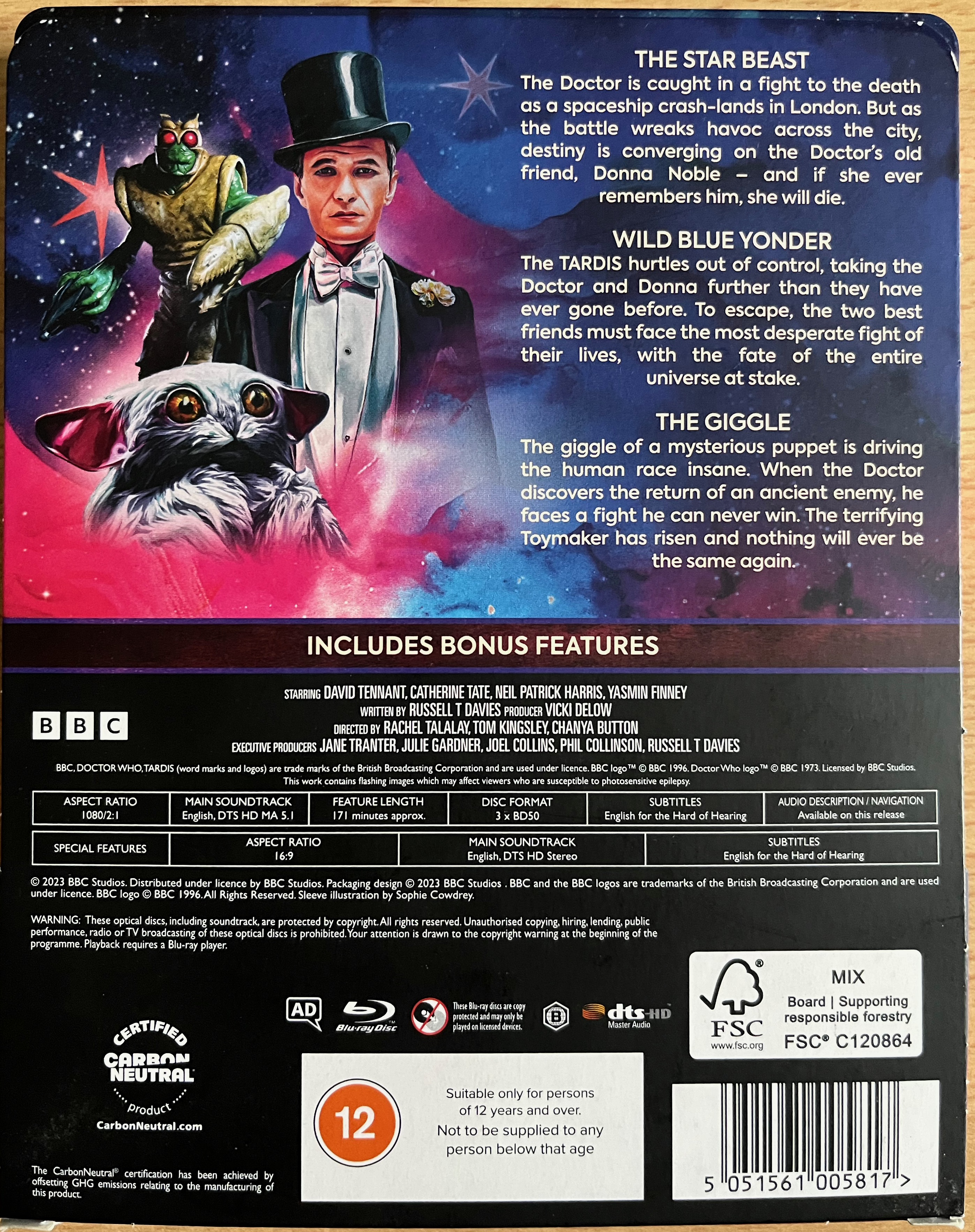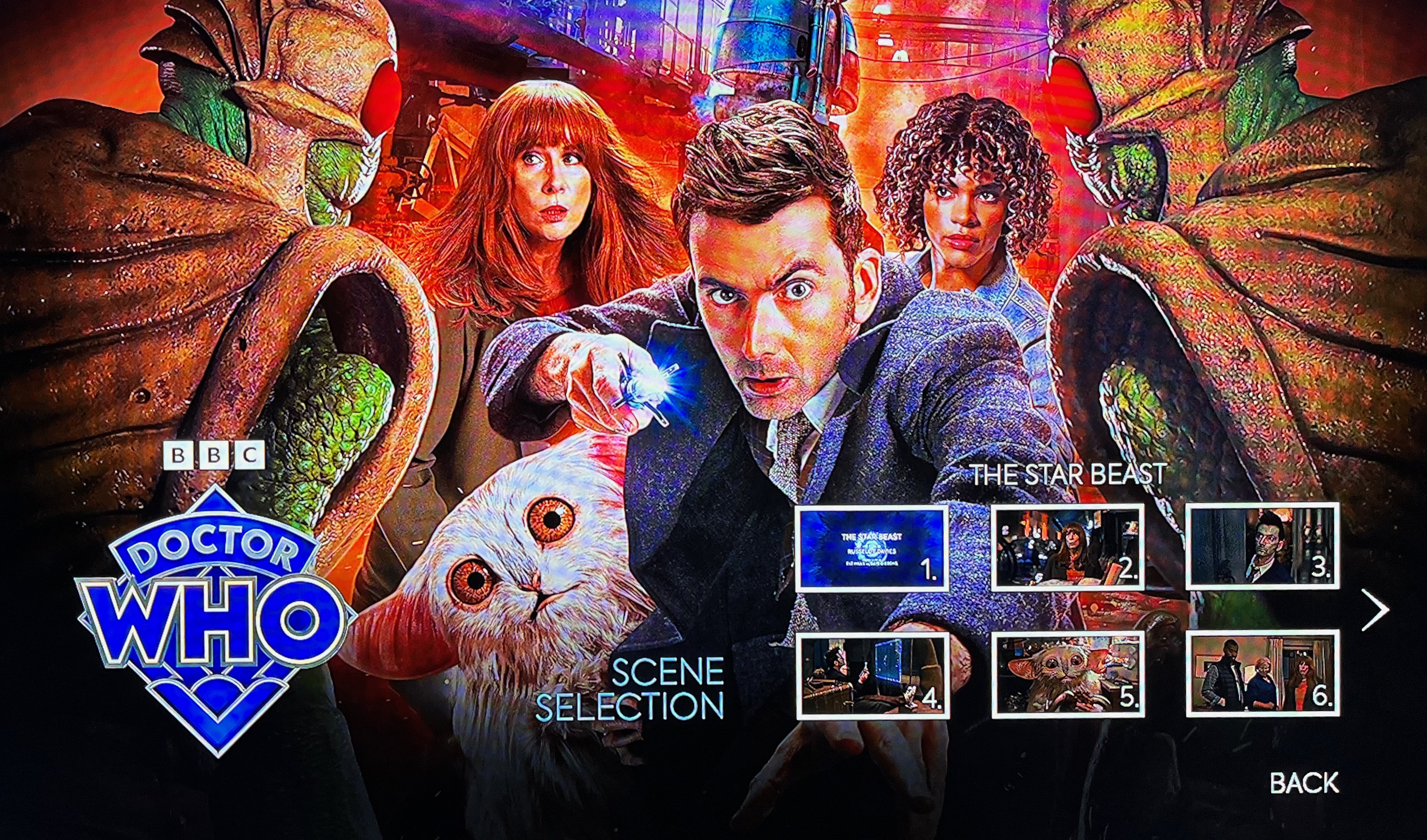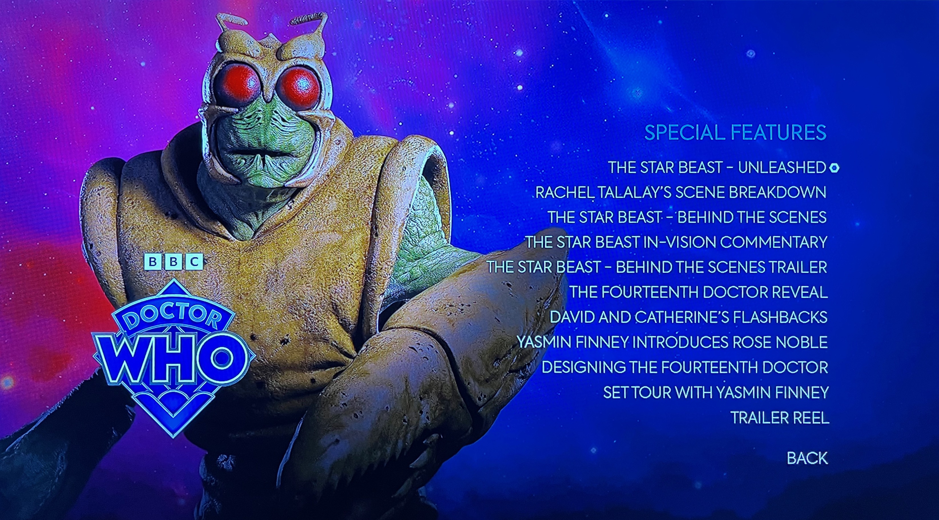 - Behind The Scenes – These additional making-of features, lasting between 9 & 15 minutes each, cover a few aspects of each episode in more detail, so they’re worth watching as they don’t repeat things from Unleashed. They can also be found on Youtube, for The Star Beast, Wild Blue Yonder & The Giggle.