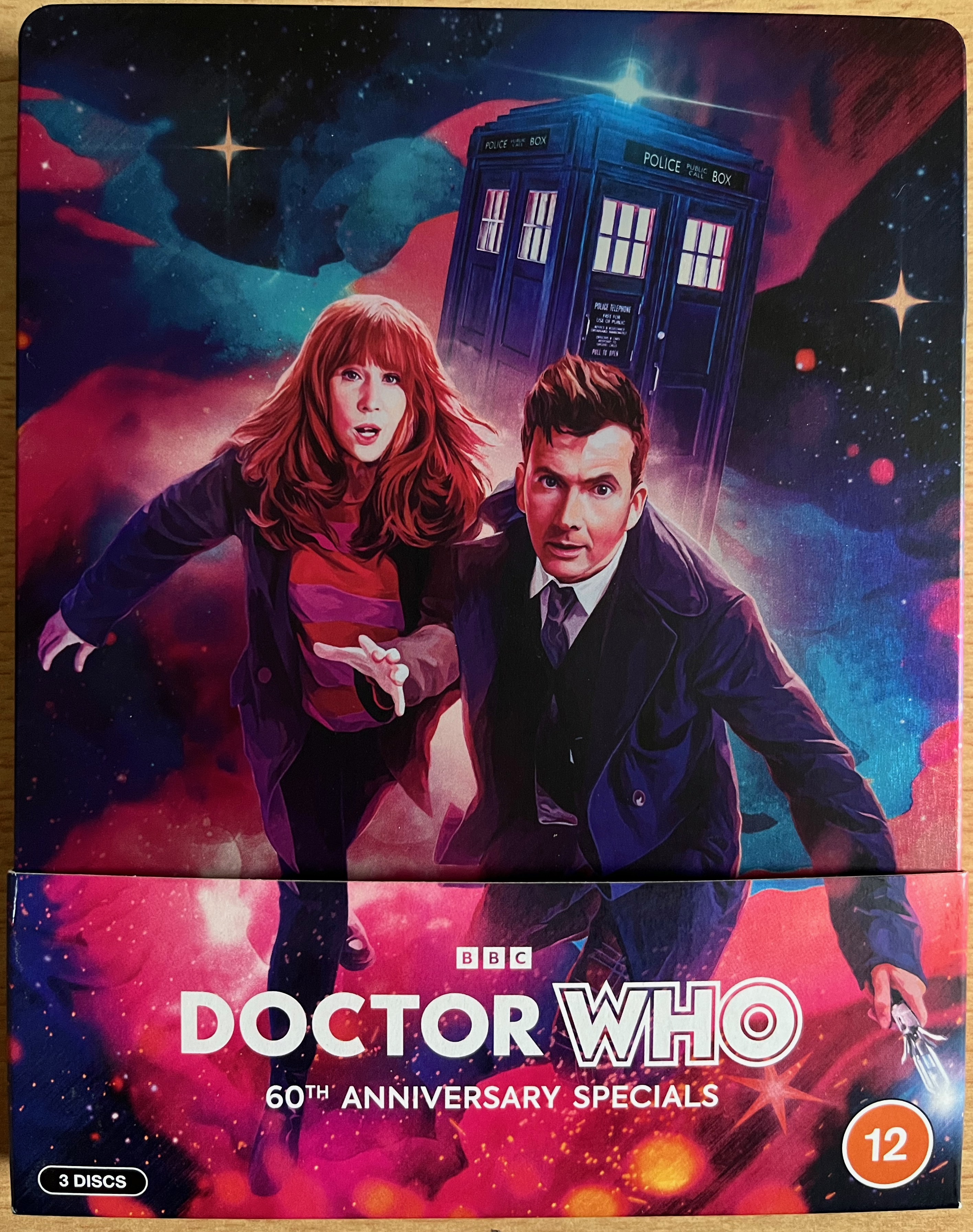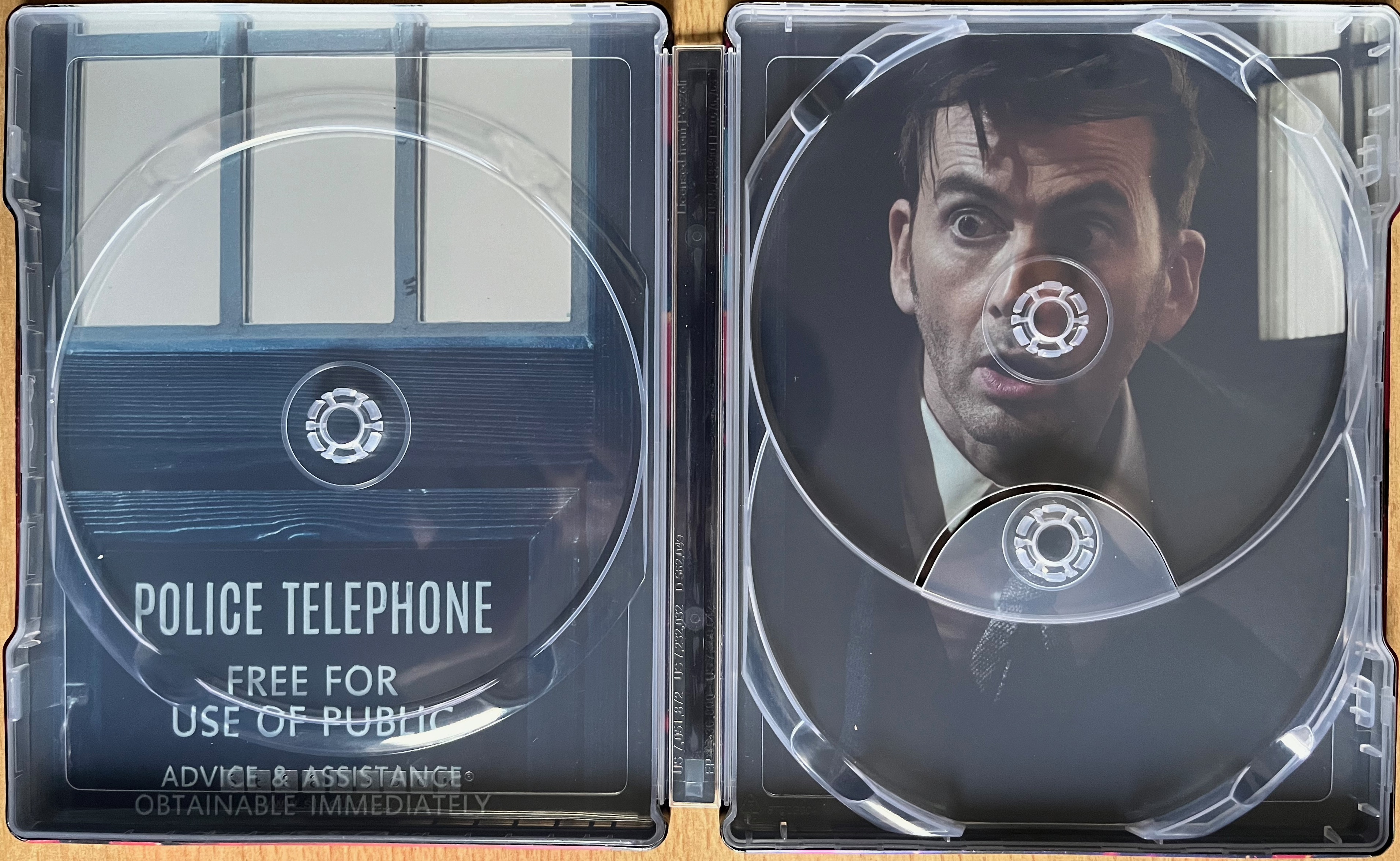 Inside the steelbook are 3 Blu-ray discs, each containing one of the specials with its related extra features. These extras aren’t listed on the outer cardboard sleeve, and there’s no flyer inside telling you the contents of each disc either, which there used to be for previous series. But the unique artwork and titles for each disc make it clear which specials they contain.