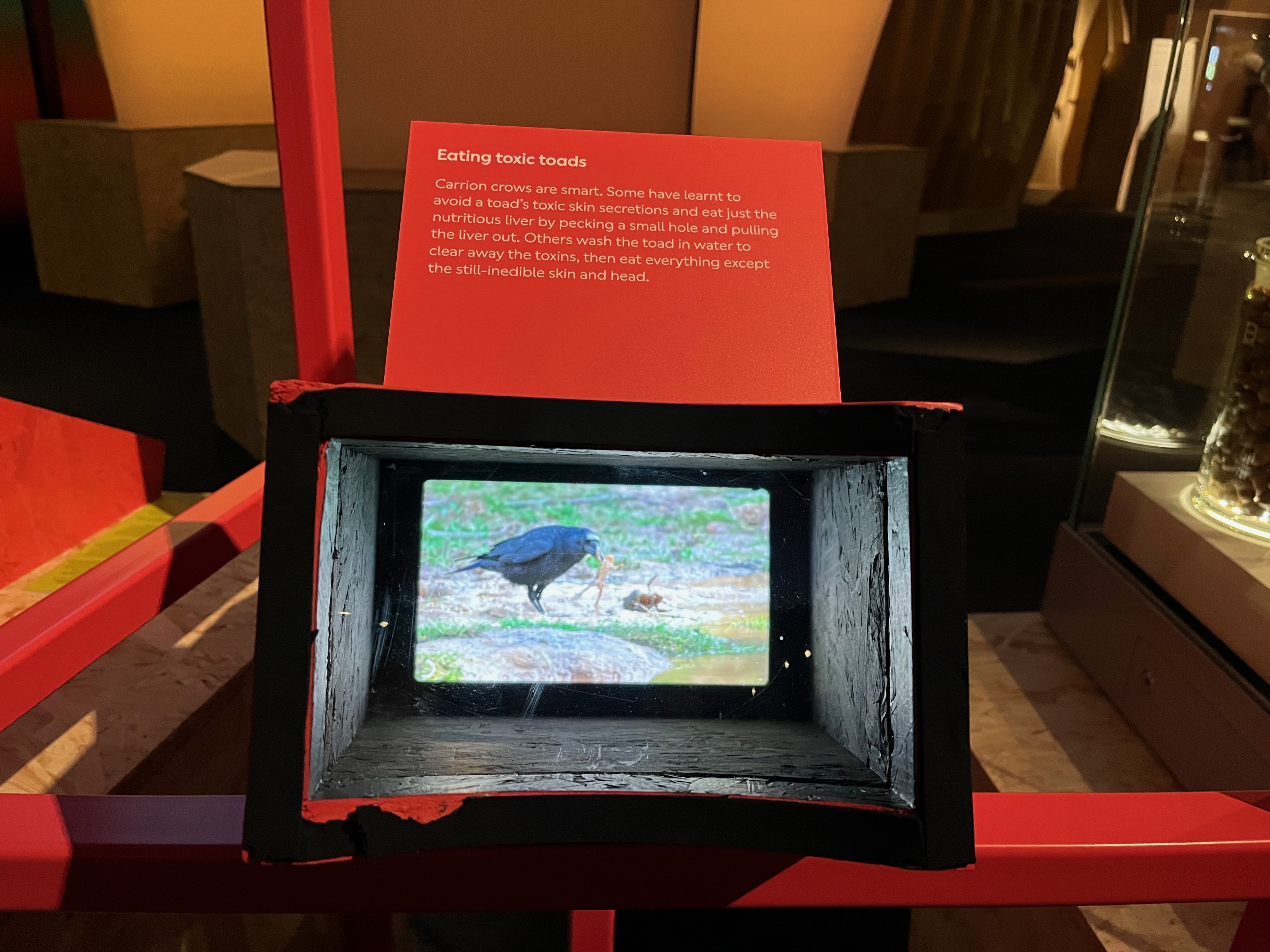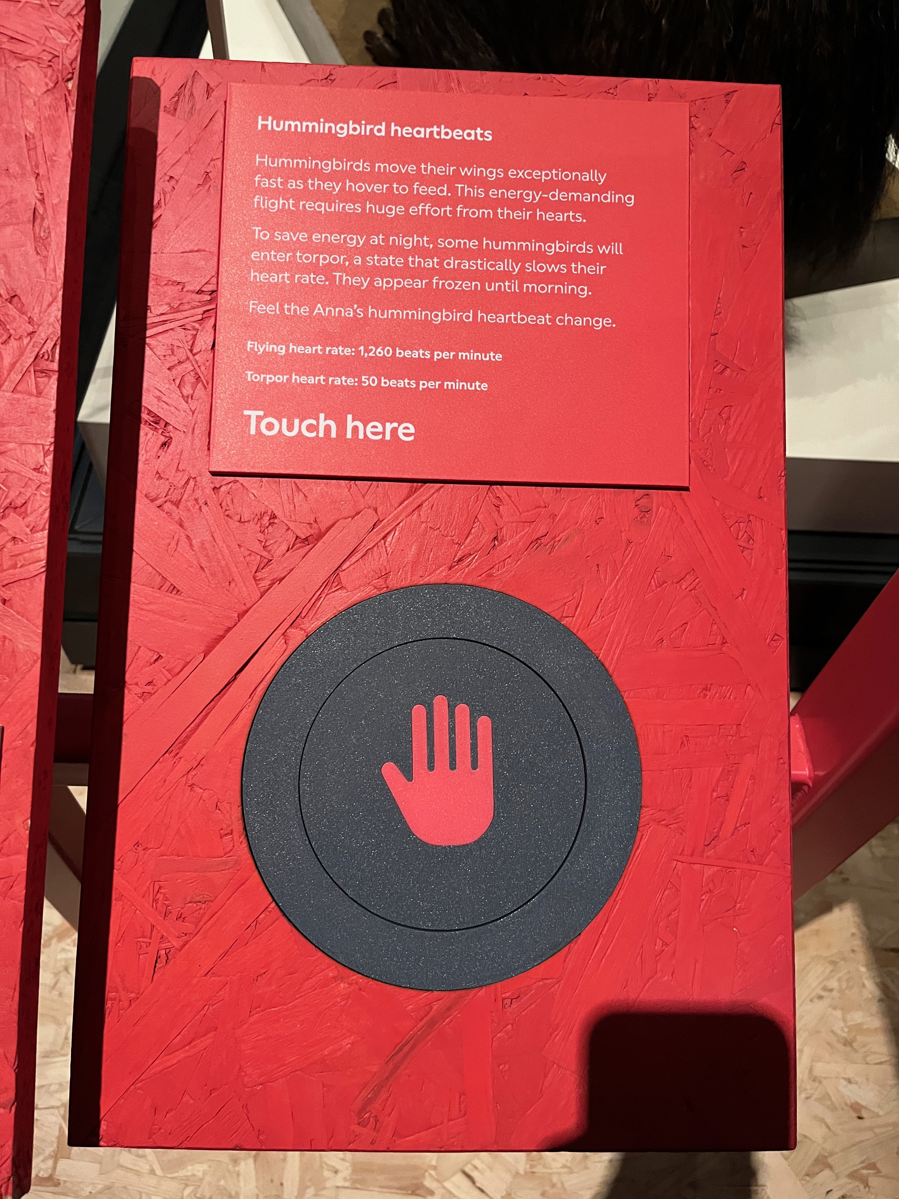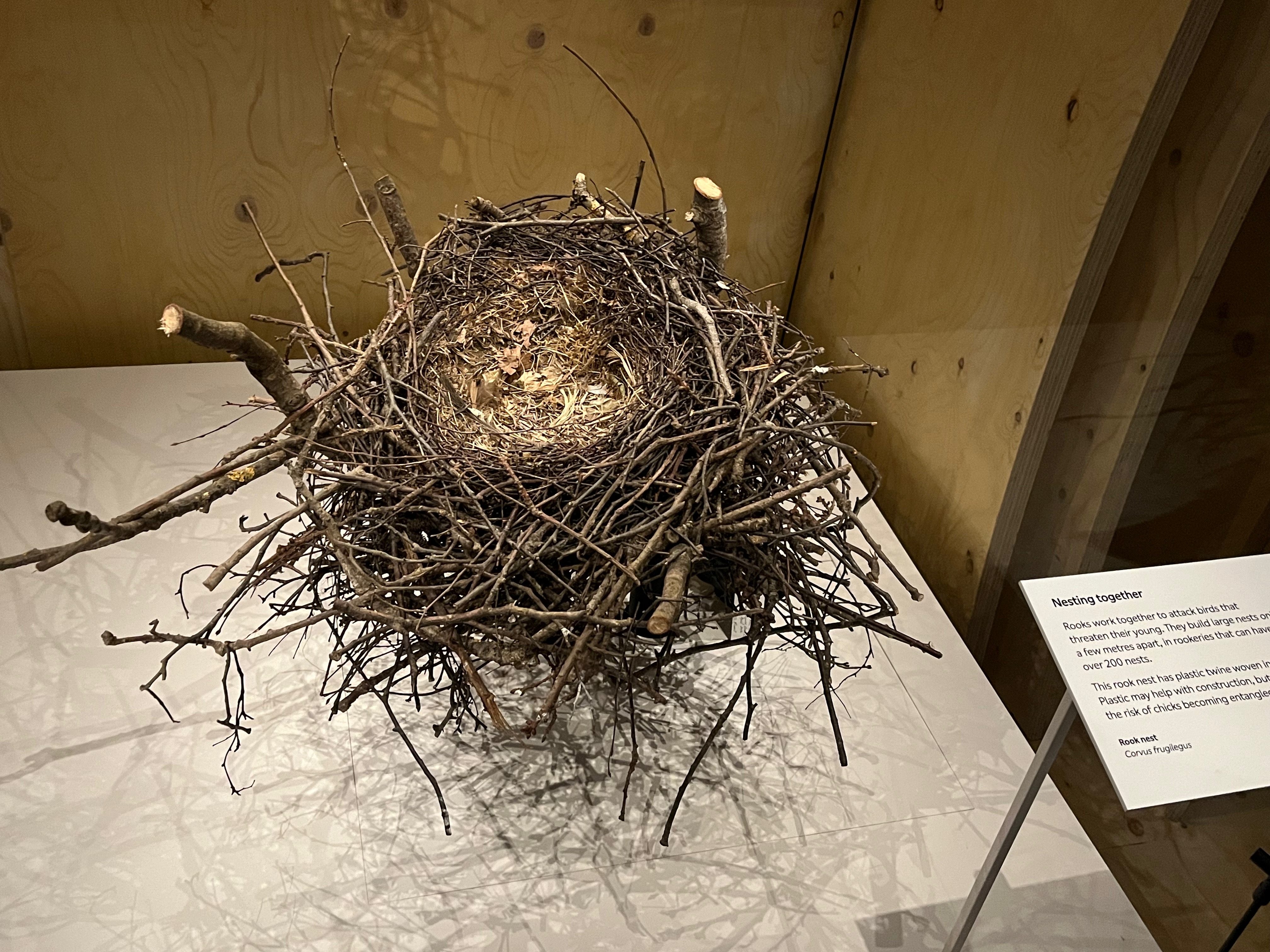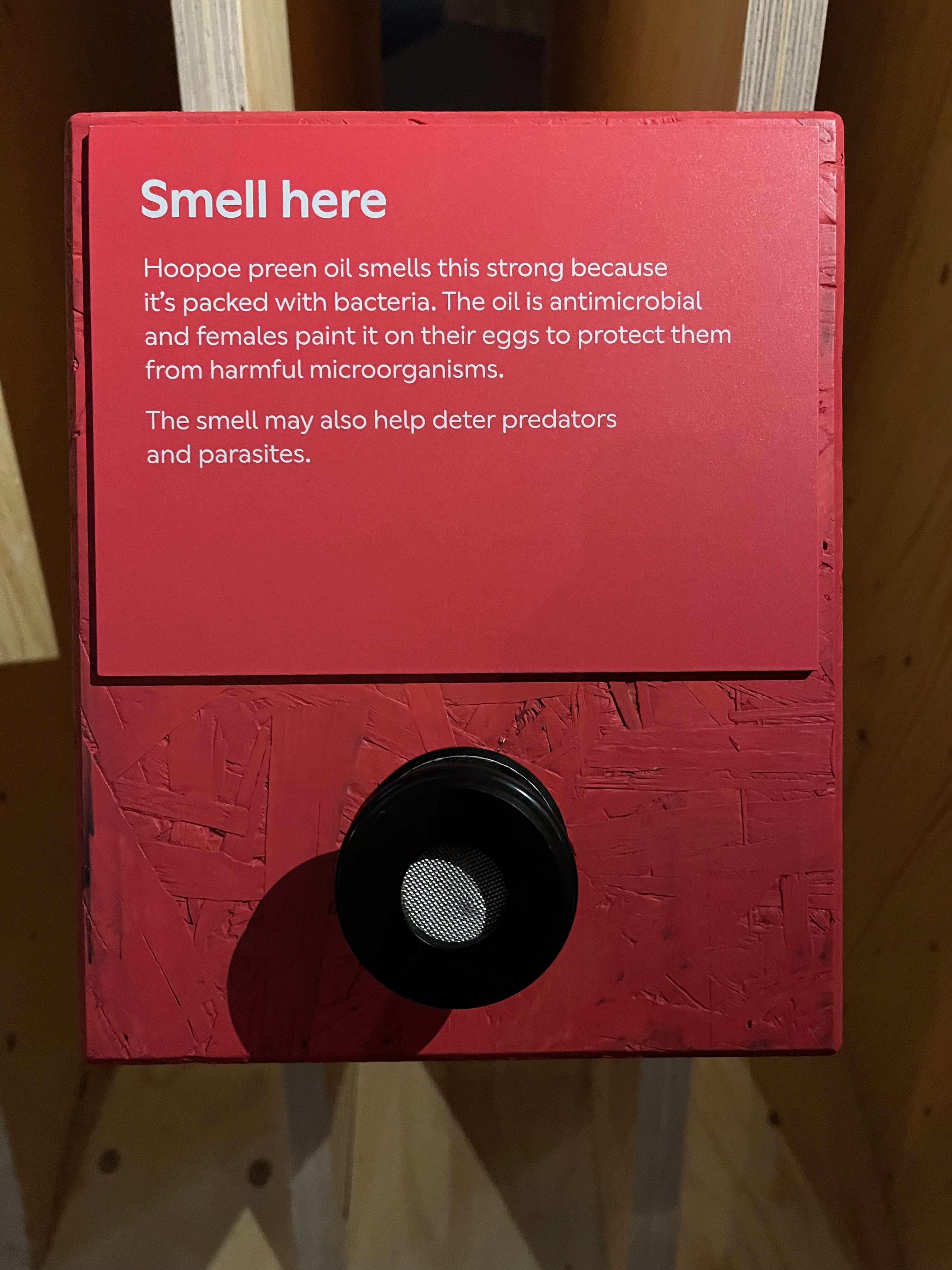 There are quite a few things you can touch as well, including models of different shaped beaks and the ability to feel a hummingbird’s heartbeat in its active and resting states. Plus there are interactive screens including a test to see if you can distinguish between the mimicking sounds of a lyrebird and other noises (it’s trickier than you think!), and a game to help a jay hide some acorns and then find them again (which I couldn’t see well enough to play, but I wasn’t bothered about that). And there are even a couple of things you can smell too. So it’s pretty interactive in that regard, which is good.