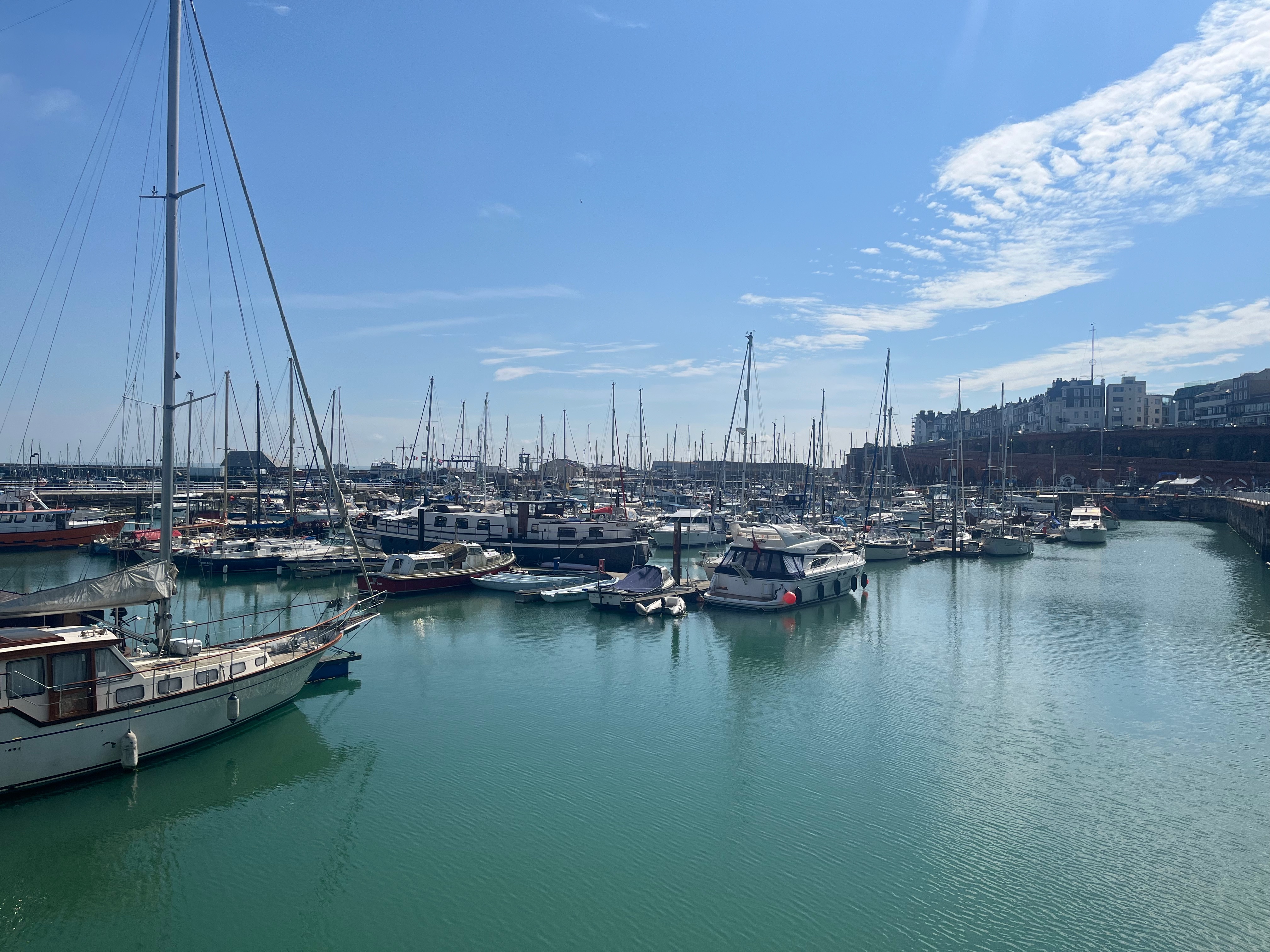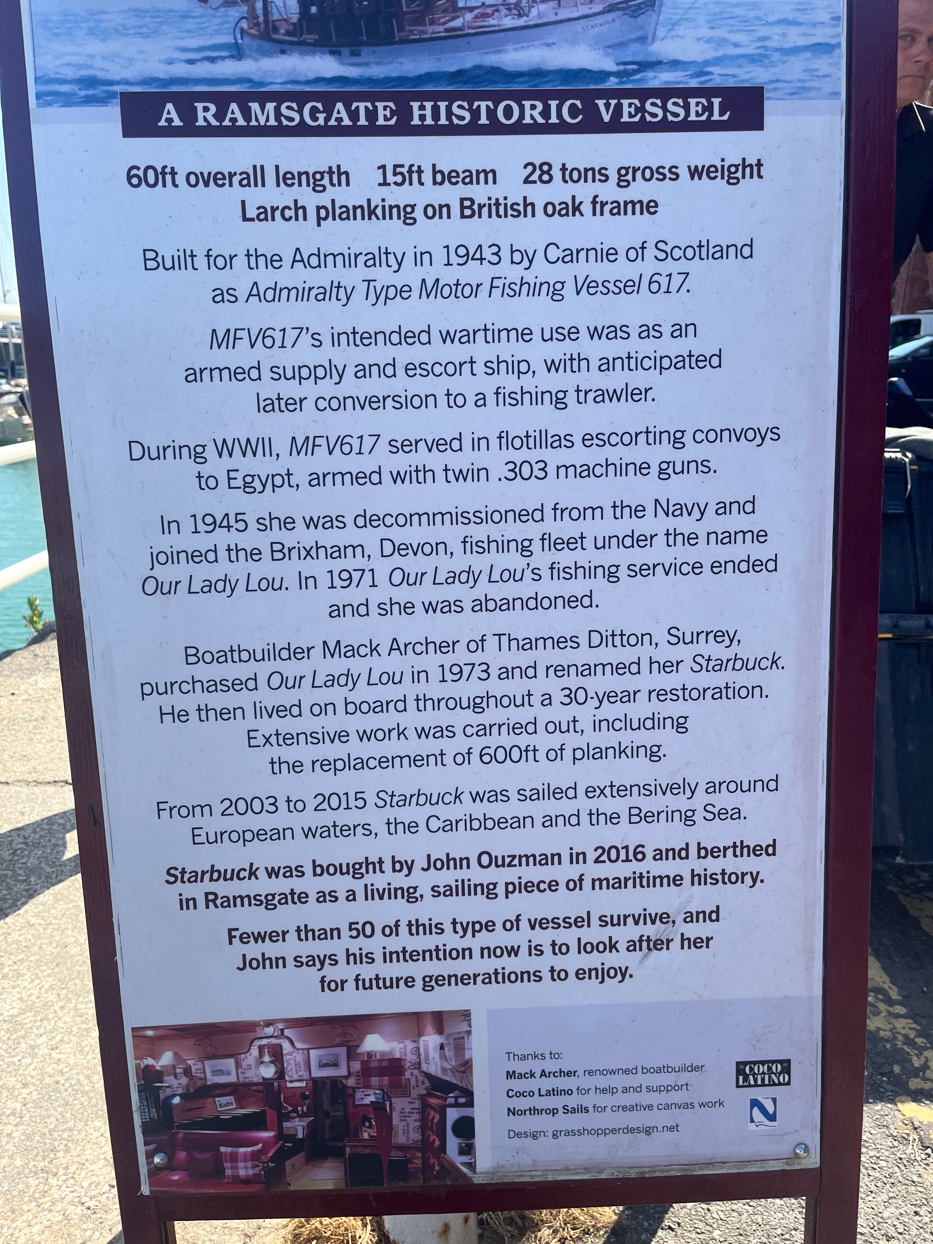 Once we felt we’d gone far enough, we doubled back and headed to the Royal Harbour. We strolled up and down the east and west piers there, spotting the Brasserie and the RNLI lifeboat station, while also admiring the many boats, including one called Starbuck that has historical significance due to its use in World War II.