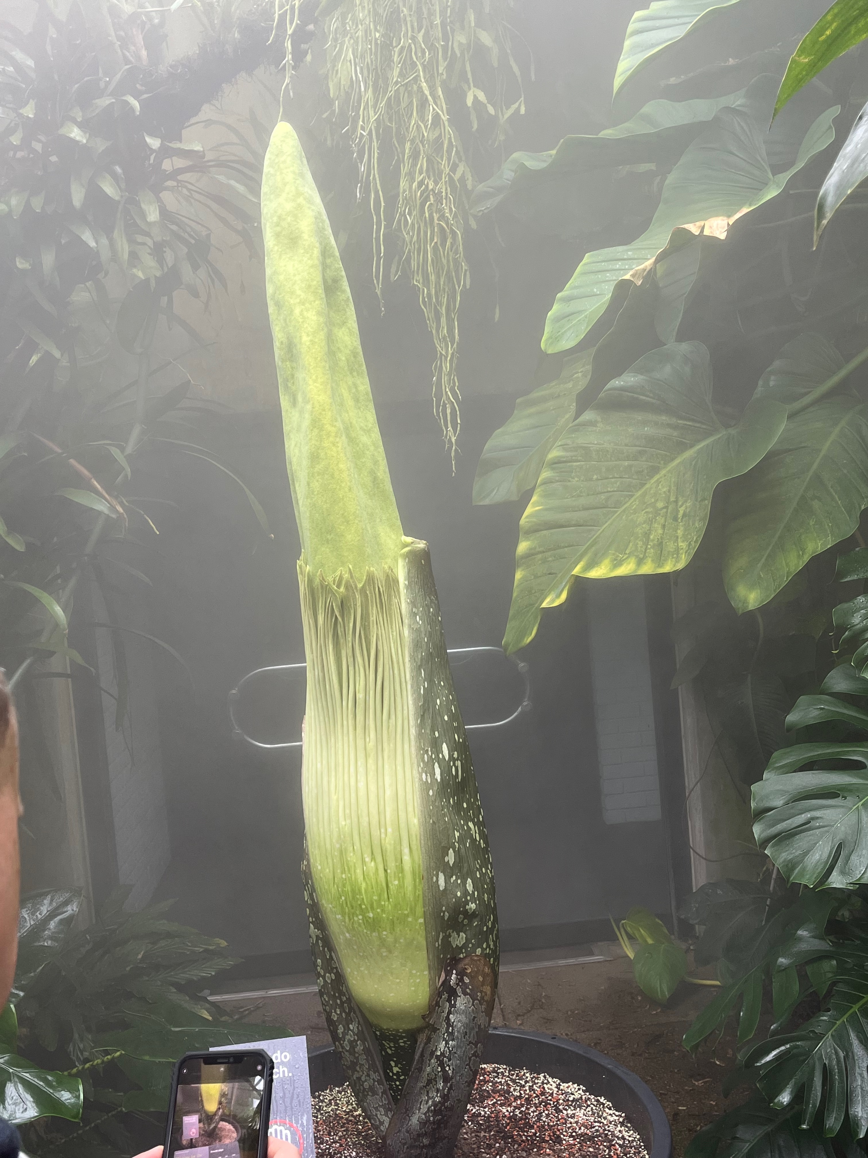 But the main general theme was smell, so we got to touch and sniff a variety of plants during the tour. Along the way we visited their beautiful Rose Garden (where we learned that you can’t have blue roses), had a discussion about how beech trees are being affected by climate change, looked at their Salvia border, admired some pretty yellow Mullein flowers with lovely soft leaves, and paid a visit to the Princess Of Wales Conservatory to see two examples of the Titan Arum (aka the Corpse Flower, which produces the largest flowers in the world and gives off a foul odour during its 2 short days in bloom – although we missed the time when it eventually bloomed later in the month, probably fortunately!).