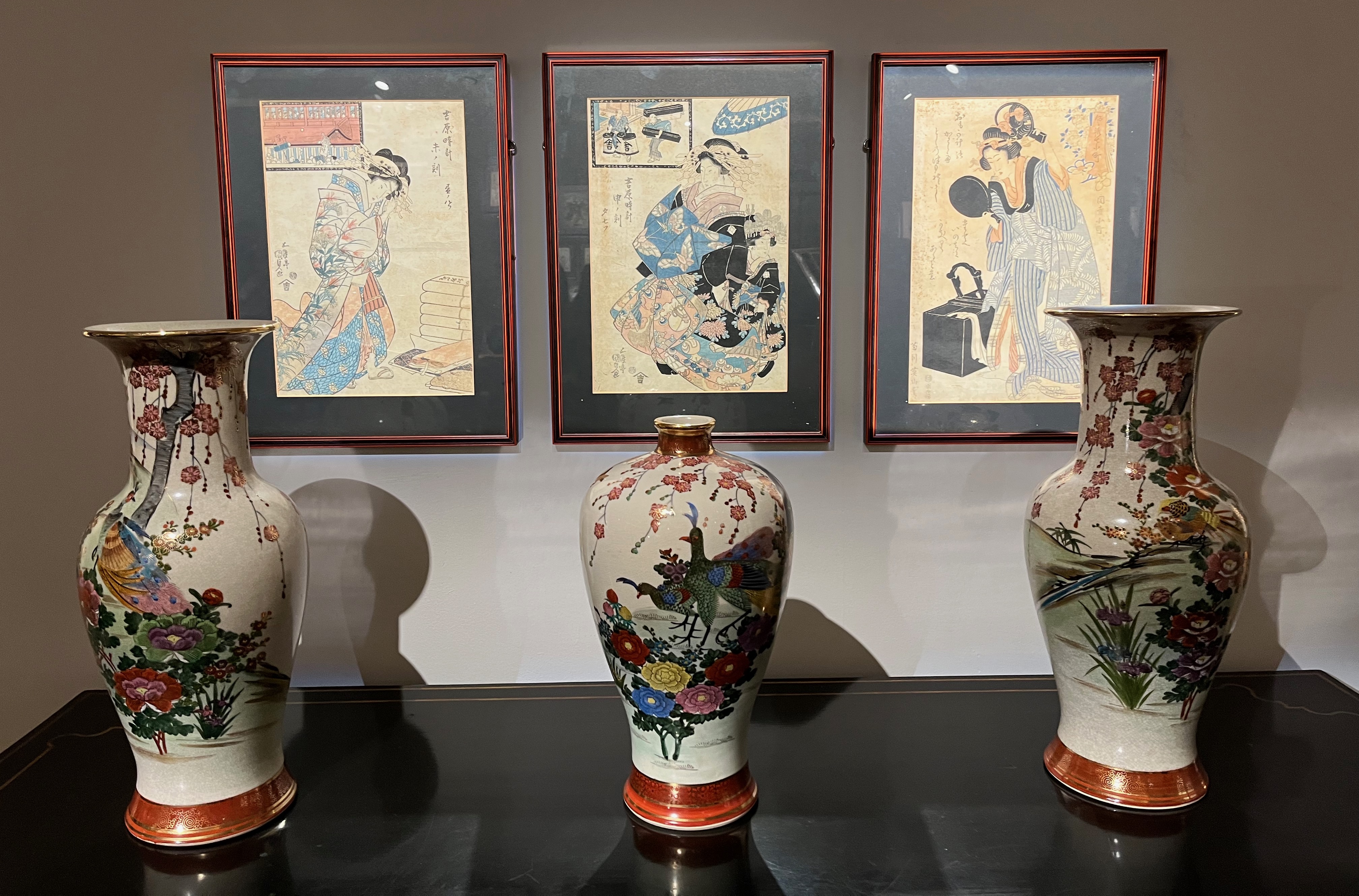 - Courtesan reading a letter under a lantern & 3 courtesan prints with artist Kikugawa Eizan (£12,700), shown with a trio of vases from the Showa period (£11,430)