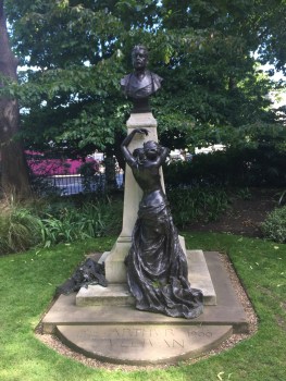 A tall granite pillar, on top of which is a bronze bust of the head and torso of Arthur Sullivan. A bronze figure of a weeping woman, naked on her top half and clothed on her lower half, leans against the plinth.