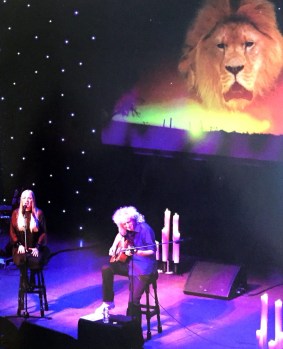 Kerry Ellis and Brian May sitting on stools as they perform on stage. There are a few candles around the edge of the stage. On the big screen behind them is a photo of a lion in the sky above a sunset landscape.