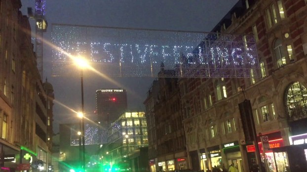 A rectangular strip of lights stretched across Oxford Street, that can be lit up in any combination to form images and messages. Here the lights are displaying the hashtag Festive Feelings.