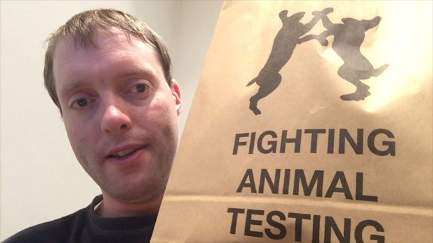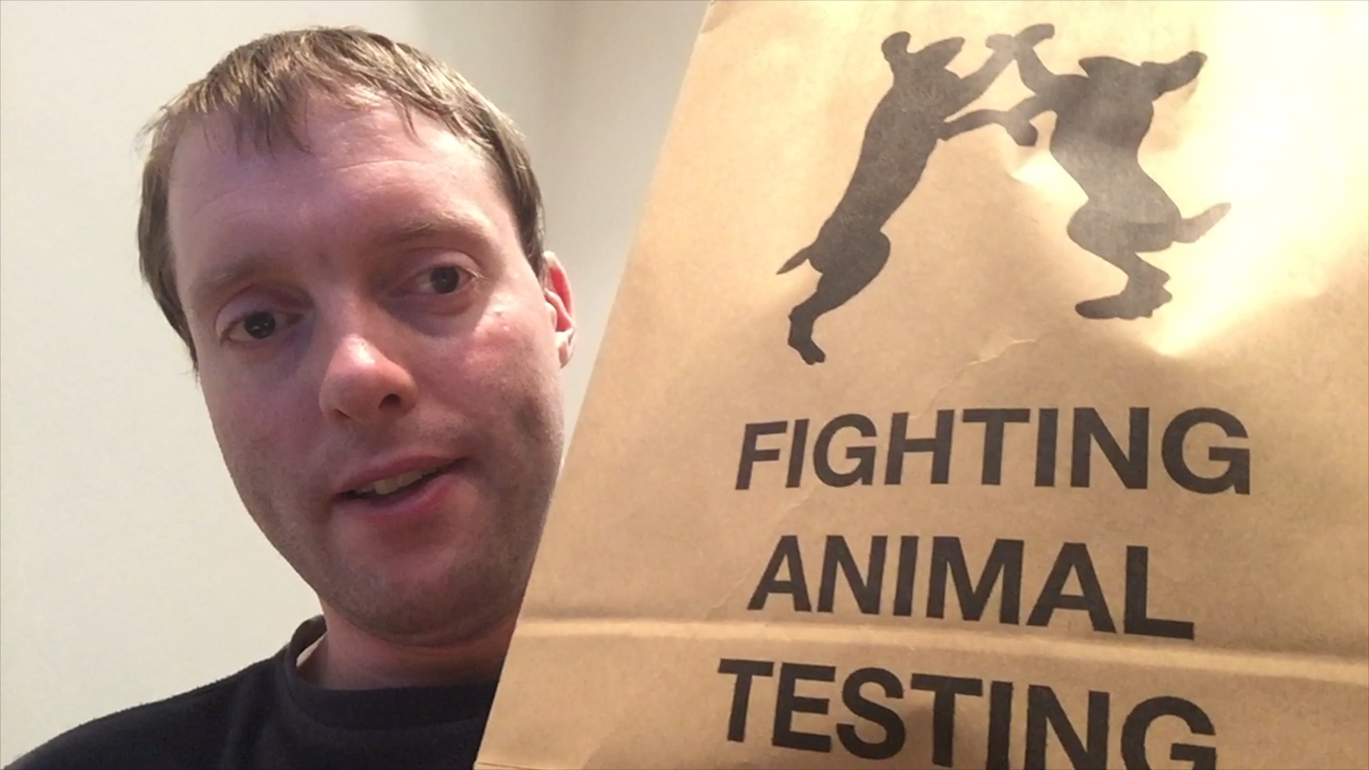 Me holding a large brown bag, which has a silhouette of 2 rabbits on their hind legs as they face each other, grasping each other’s arms, above the words Fighting Animal Testing.