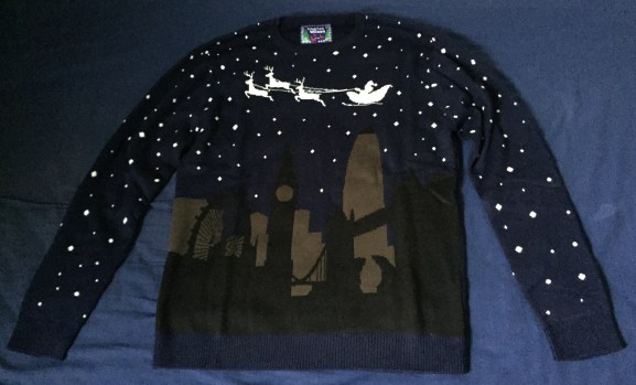 Navy jumper with black and brown silhouettes of London landmarks on the bottom half, while white silhouettes of Santa and 3 reindeer fly over the top. White stars cover the background of the entire jumper.