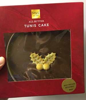 Tunis cake from Marks & Spencer – madeira sponge with a thick chocolate layer on top, and a marzipan holly decoration in the centre.