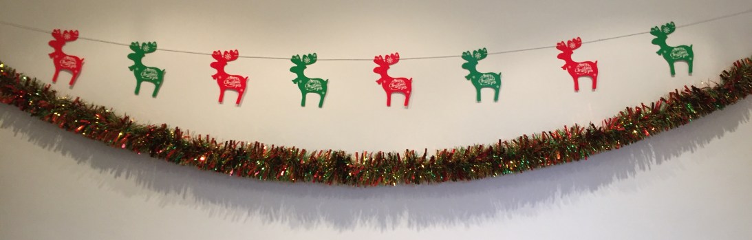 Threaded along a line of string on the wall are alternating red and green cutouts of reindeer with Christmas greetings written on them. Below them is a long length of golden brown tinsel along the wall.