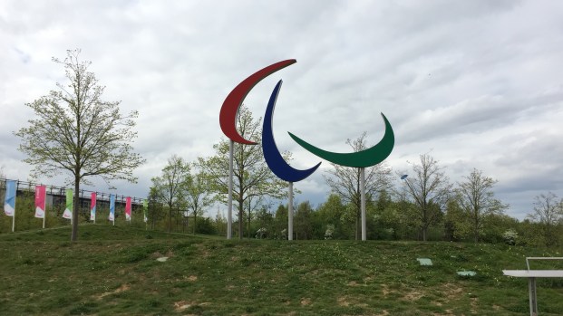 Large sculpture of the Paralympics symbol, made of 3 agitos marks in red, blue and green. It’s held up on 3 poles, in the middle of the grass with trees in the background.