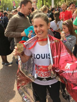 Louise Fairhurst holding up her London Marathon medal – a downward pointing pentagon shape with an image of Tower Bridge in the centre.